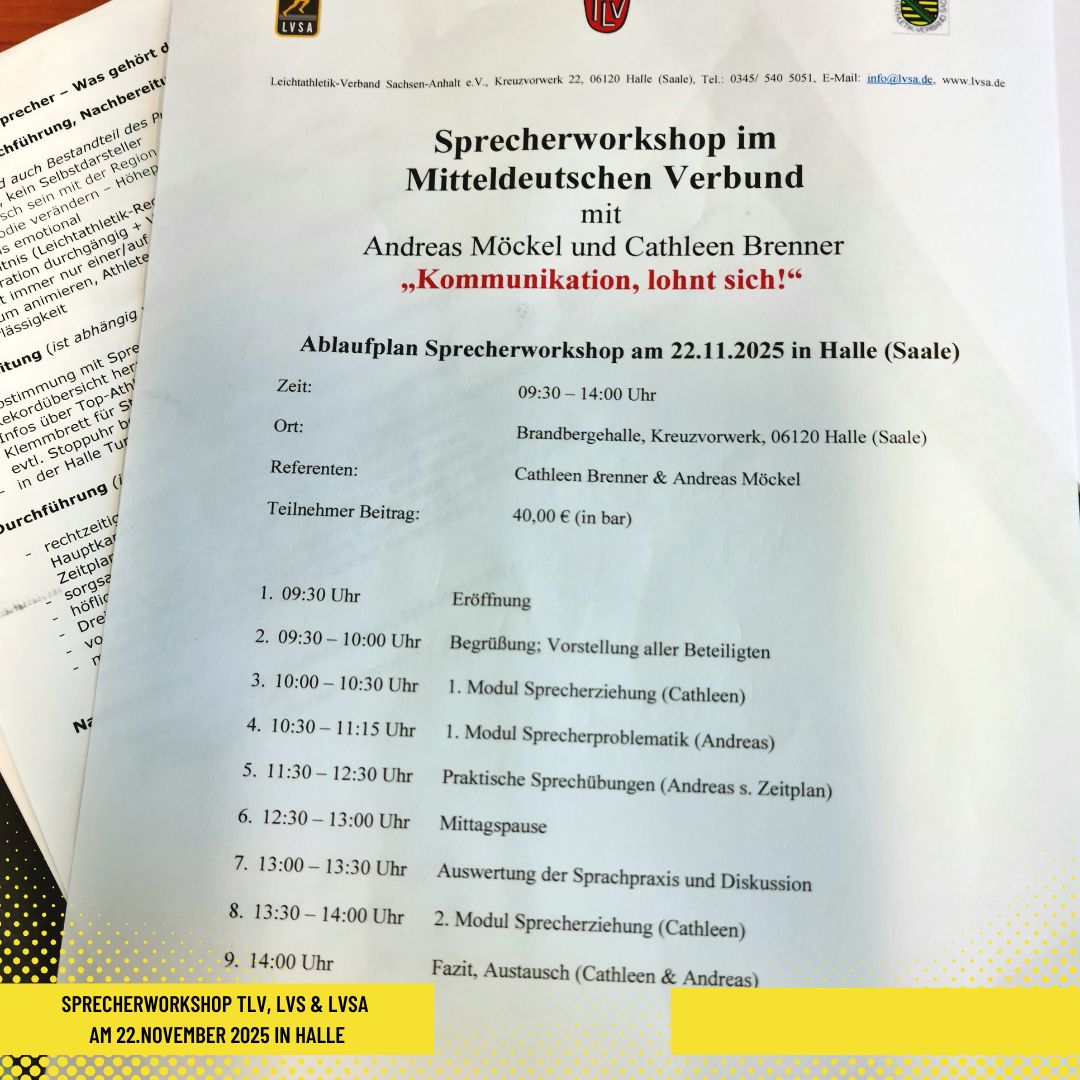 Am nächsten Tag, 22. November 2025 folgte zugleich ein weiterer kommunikativer Part, der Mitteldeutsche Sprecherworkshop fand mit dem Urgestein des Moderierens, Andreas Möckel aus Erfurt in Halles Brandbergehalle statt. Auch zum wiederholten Mal unterstützte ihn hierbei Cathleen Brenner als Logopädin, um neben der Vorbereitung, Durchführung und Nachbereitung des Sprechens von Wettkämpfen, auch das Wissen, wie man spricht, anzusprechen. Neben theoretischen Untermalungen, folgten sodann die praktischen Mikrofonübungen unverzüglich am lebenden Patienten, den Athleten und Athletinnen im Wettkampf. Die vier Teilnehmer aus Sachsen, Thüringen und Sachsen-Anhalt setzten dabei stellenweise zum ersten Mal, teilweise zum wiederholten Mal, ihre erworbenen Kenntnisse direkt um.