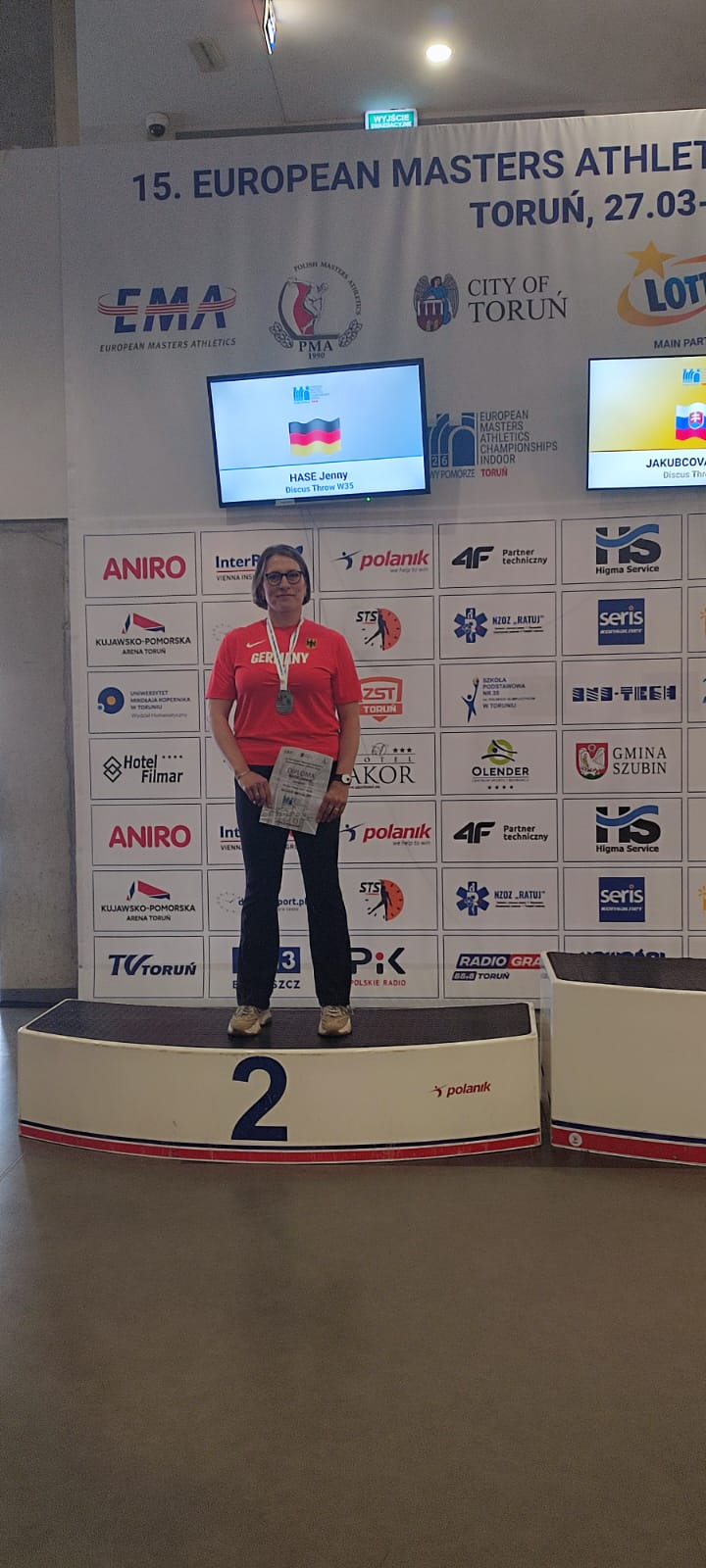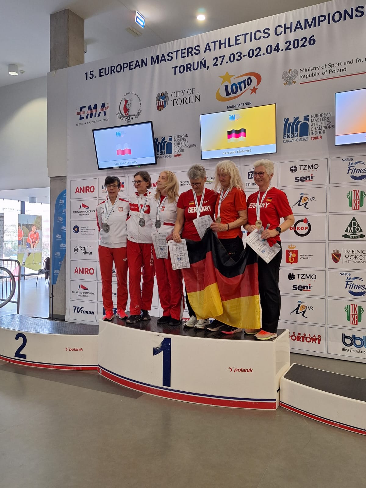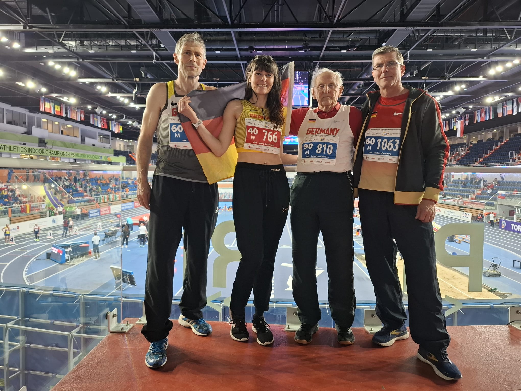 Das deutsche Masters-Team hat bei den Hallen-Europameisterschaften, welche vom 27.03. bis zum 02.04.2026 in Torun (Polen) stattfanden, den 1. Platz im Medaillenspiegel errungen. Die 21 Athleten und Athletinnen aus Sachsen-Anhalt trugen dabei einen großen Teil dazu bei. So errang u.a. Lothar Huchthausen (SV Rot-Weiß Arneburg) in der AK M90 in fünf Disziplinen jeweils den 1. Platz. Er warf den Diskus hierbei auf 18,30 m, den Hammer auf 22,36 m, der Speer landete bei 23,48 m, im Gewichtswurf standen 8,52 m zu Buche und die Kugel stieß er 8,41 m weit. Jenny Hase vom MLV-Einheit erkämpfte sich in der W35 sowohl im Diskuswurf mit 35,69 m als auch im Kugelstoßen mit 12,74 m die Silbermedaille. Julia Dreiling sprang in der W40 5,30 m im Weitsprung und belegte damit den Bronzerang. Des Weiteren konnte sie sich mit einem schnellen Lauf über die Hürden für das Finale in ihrer Altersklasse qualifizieren. Holger Fettke (M55) von Union 1861 Schönebeck erkämpfte sich im Hammerwurf mit 52,67 m und im Gewichtswurf mit 19,25 m den jeweils 3. Rang.