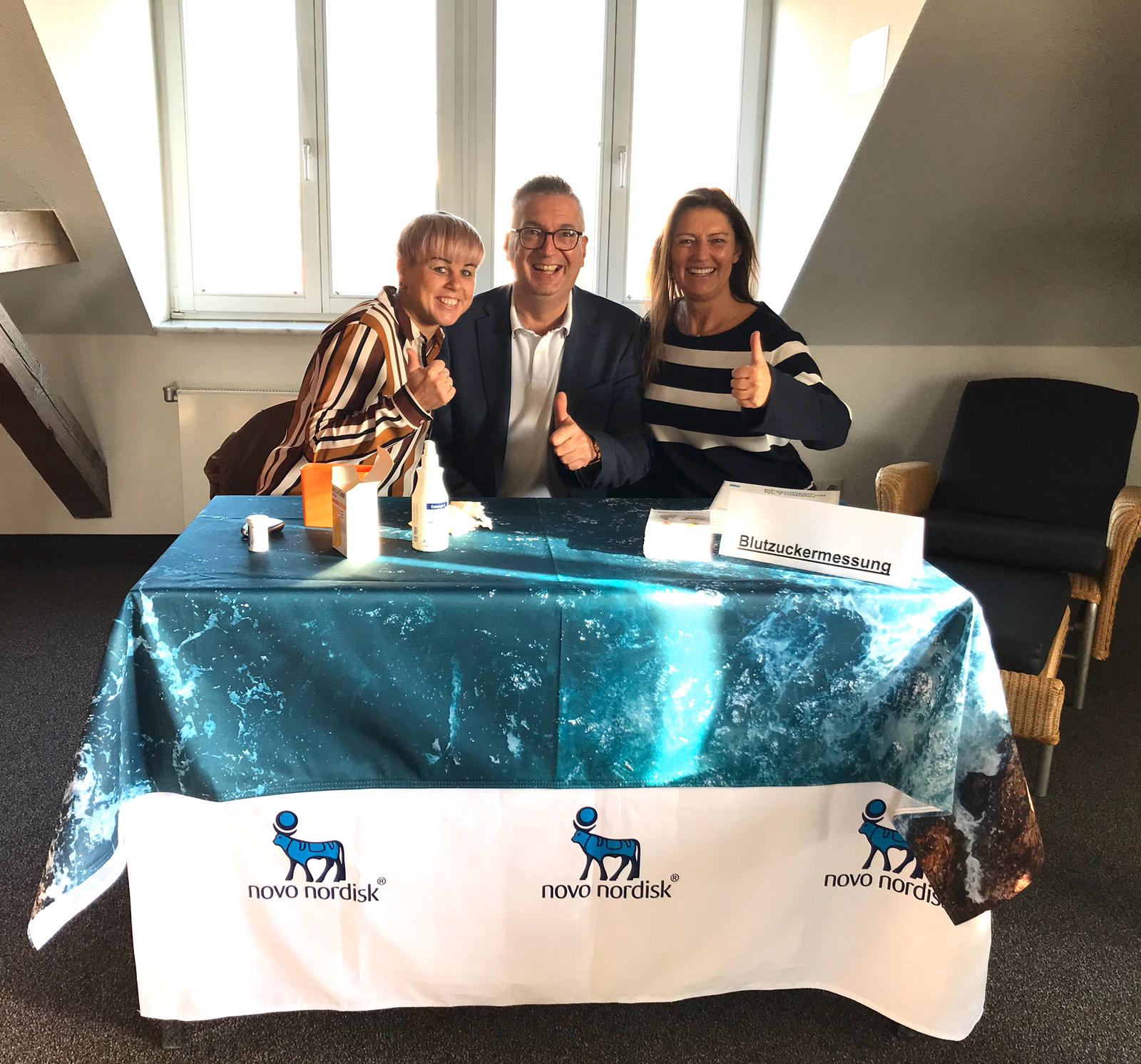 Neben den Themenpunkten bestand ein ganztätiges Angebot durch die Mitarbeiter und Mitarbeiterinnen unseres Hauptförderers, der Firma Novo Nordisk, die für die Teilnehmer und Teilnehmerinnen vor und nach den Trainingseinheiten einen Blutzuckertest anboten, welches wohlwollend durch die Teilnehmerinnen und Teilnehmer angenommen wurde.
