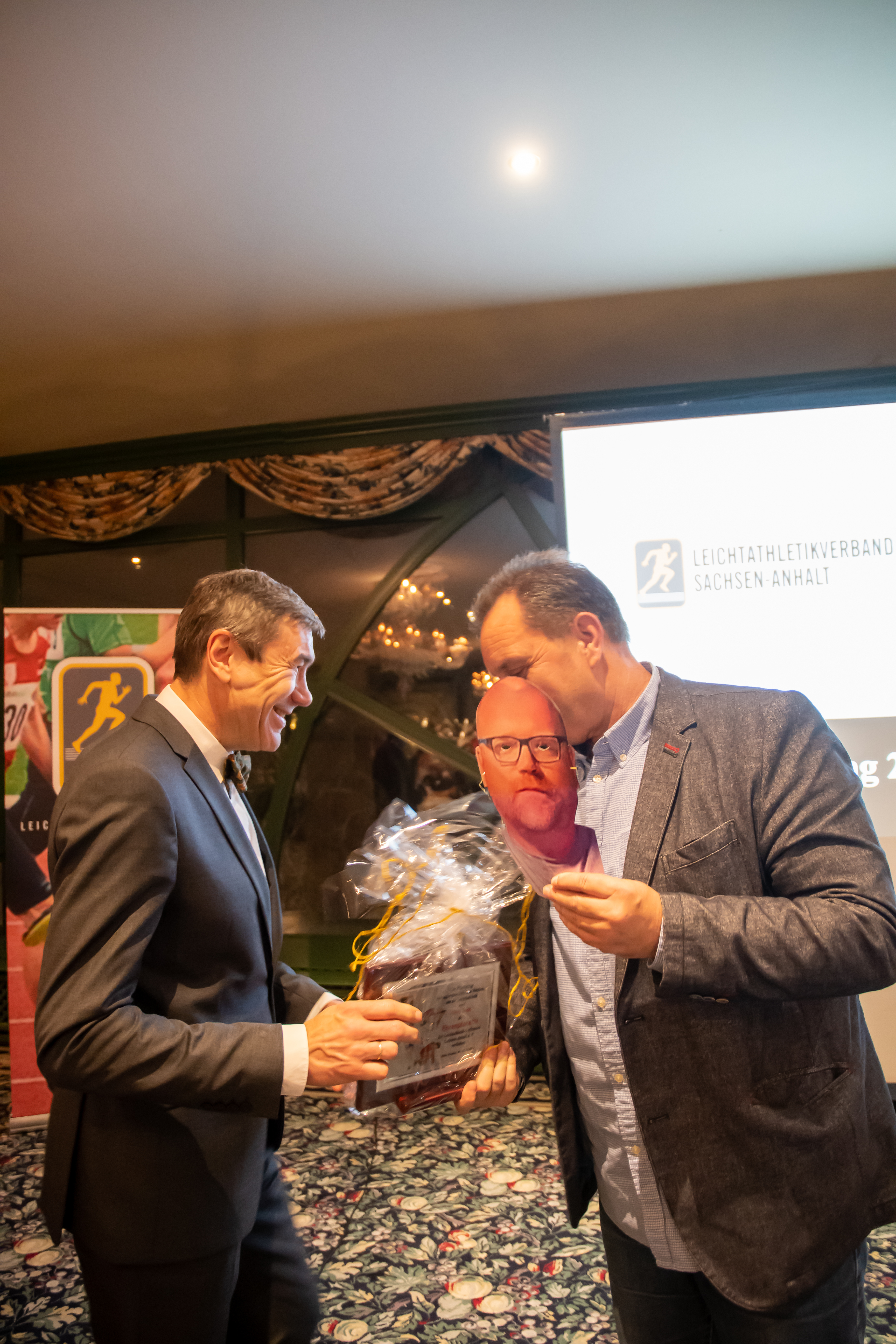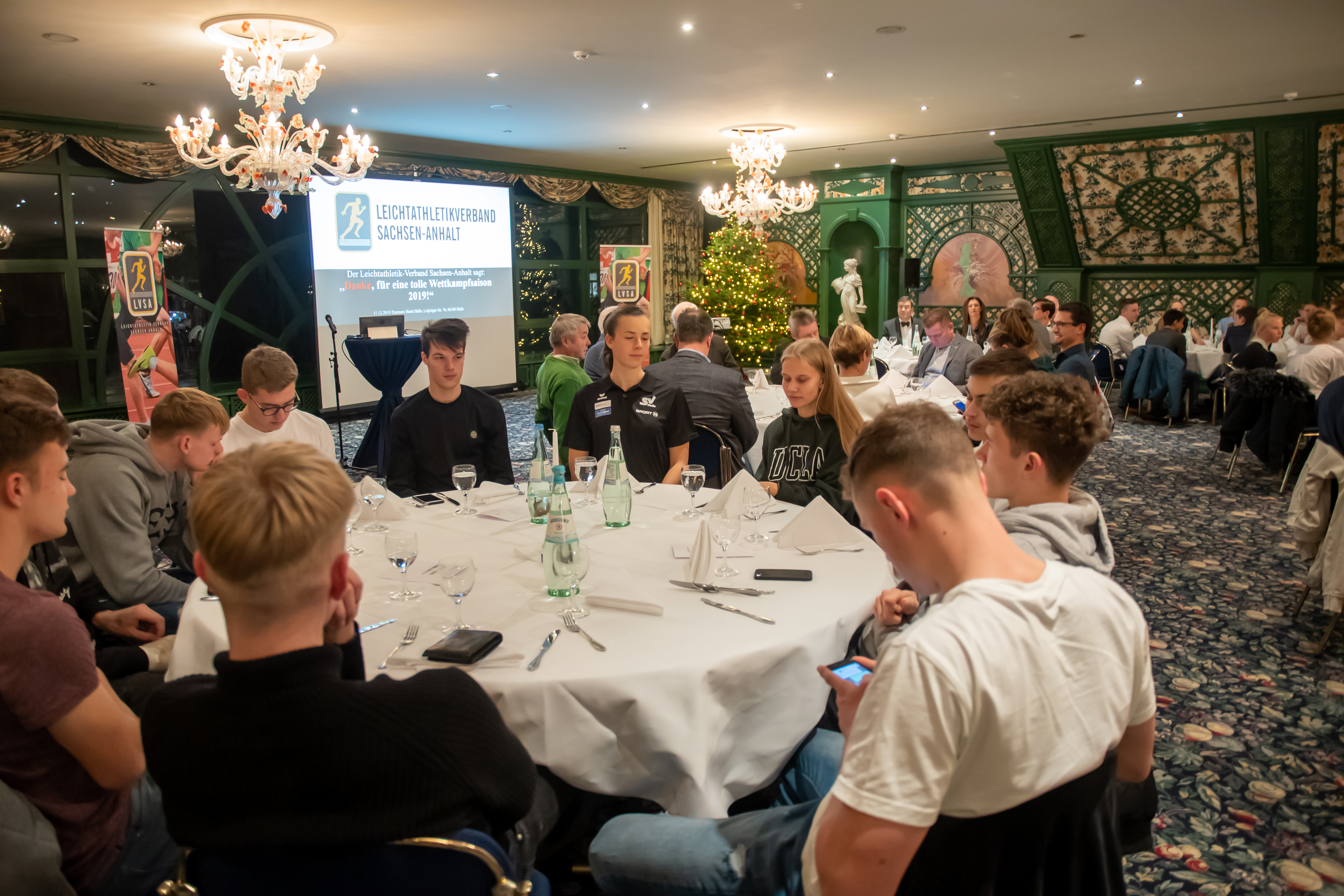 Am 11. Dezember 2019 war es wieder soweit, die Verantwortlichen des Leichtathletik-Verbandes Sachsen-Anhalt ehrten ihre internationalen Teilnehmer*innen sowie inter/nationalen Medaillenträger des zurückliegenden Wettkampfjahres 2019. Im Kongresszentrum des Dormero Hotel in Halle wurde bei gutem Essen nicht nur das Trainings- und Wettkampfjahr 2019 multimedial in vergnüglichen Videosequenzen kurzweilig aufbereitet, sondern auch die Trainer- und Präsidiumsarbeit entsprechend amüsant gewürdigt. Weiterhin wurden neben den internationalen Starter*innen (s. Foto 1) auch die besten Trainer*innen des Jahres 2019 gekürt. So konnten Katja Schreiber, Wolfgang Thier und Philipp Töpfer ihre Trainerauszeichnungen persönlich entgegennehmen. Wohingegen für Rene Sack und Jürgen Eberding, als gewürdigte Trainer, ein kleiner Kunstgriff dienen musste, um ihre Anwesenheit zu mimen. Der Einladung gefolgt war u. a. auch eine Vertreterin des langjährigen LVSA-Partners und -Sponsors, Novo Nordisk. Auch die Volksbank Halle (Saale) hinterließ, in Form einer kleinen Aufmerksamkeit für die Athleten*innen, einen herzlichen, weihnachtlichen Gruß.