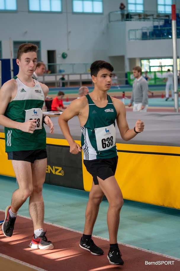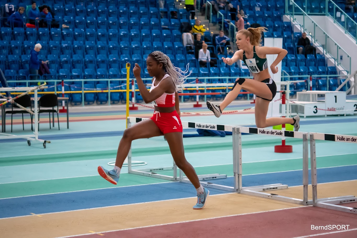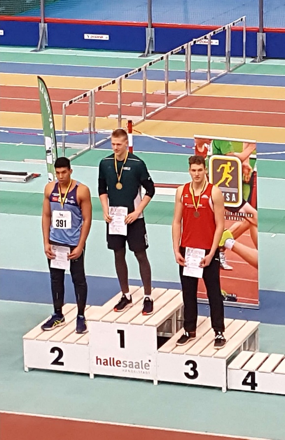 Weitere tolle Leistungen zeigte u. a. die U20-Staffelbesetzung des SV Halle in der Besetzung Till Blättermann, Ludwig Scharge, Yannick Herden und Aron Beuchelt (s. Foto), die nur 01:29,42 min für die 4 x 200 m benötigten. Auch die U20-Staffeldamen des SV Halle, in der Besetzung Vanessa Voigt, Friederike-Maxi Müller, Sarah Schermaul und Marlene Körner standen den Herren in nichts nach. Sie gewannen ihr 4 x 200 m Staffelrennen in flotten 01:40,76 min. Im 3.000 m Rennen der männlichen Jugend U18 siegte in neuer persönlicher Bestzeit von 09:12,60 min Anton Saar (Turbine Halle). Im 3.000 m BG der MJU18 siegte der Deutsche Meister aus 2019, Jassam Abu El Wafa (SV Halle) in 15:19,13 min vor seinem Vereinskollegen Jadon Henze (15:41,70 min, s. Foto). Emmanuel Agbo Anih (s. Foto, SV Halle) warf seinen 1,5 kg Diskus auf eine neue persönliche Bestweite von 54,76 m und belegte damit Rang zwei vor Steven Richter (56,55 m). Moritz Morstein und Arne Nebelung (beide SC Magdeburg) zeigten im Speerwurf der MJU18 einen guten Wettkampf. Mit 64,49 m und 59,34 m belegten sie Platz eins und zwei. Im Hammerwurf der männlichen U18 siegte Leon Bierende vom SV 1885 Teutschenthal/WLT. Er warf sein Fluggerät auf 55,50 m. Im 60 m Finale der WJU18 wurden schnelle Sprintzeiten erneut durch Lara-Noelle Steinbrecher gezeigt. Sie überquerte die Ziellinie nach 7,65 s. Im Vorlauf war sie bereits flotte 7,57 s unterwegs. Auf Rang zwei landete in 7,66 s Cora Kunze (Dresdner SC 1898) vor Anna Mootz (SC Magdeburg), die 7,74 s benötigte. In der MJU16 zeigten die Nachwuchsgeher des SV Halle ein "Kopf an Kopf Gehen". Nick Joel Richard siegte in 15:20,74 min knapp vor Arvid Kockel (15:23,25 min) über die 3.000 m. In der WJU16 siegte über 60 m Luna Nowak (SC Magdeburg) mit einer flotten Zeit von 7,69 s vor ihrer Teamkollegin Chelsea Kadiri, die nach 7,78 s die Ziellinie überquerte. Im 60 m Hürdenfinale drehte Chelsea (s. Foto) den Spieß um und siegte in schnellen 8,90 s vor Luise Beutel vom SV Halle (9,12 s). Zuvor sicherte sich Luise im Weitsprung mit 5,43 ihre Goldmedaille.