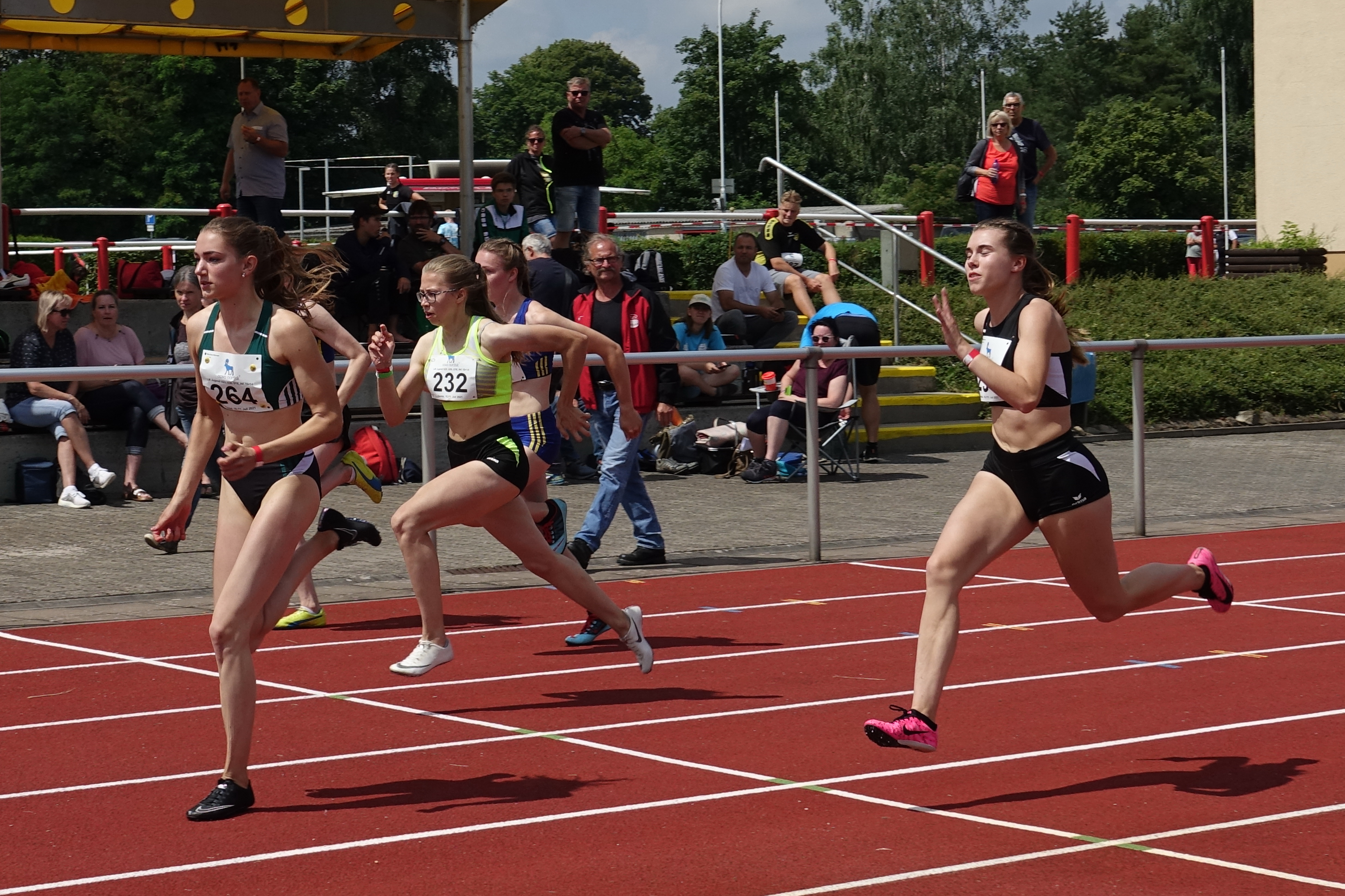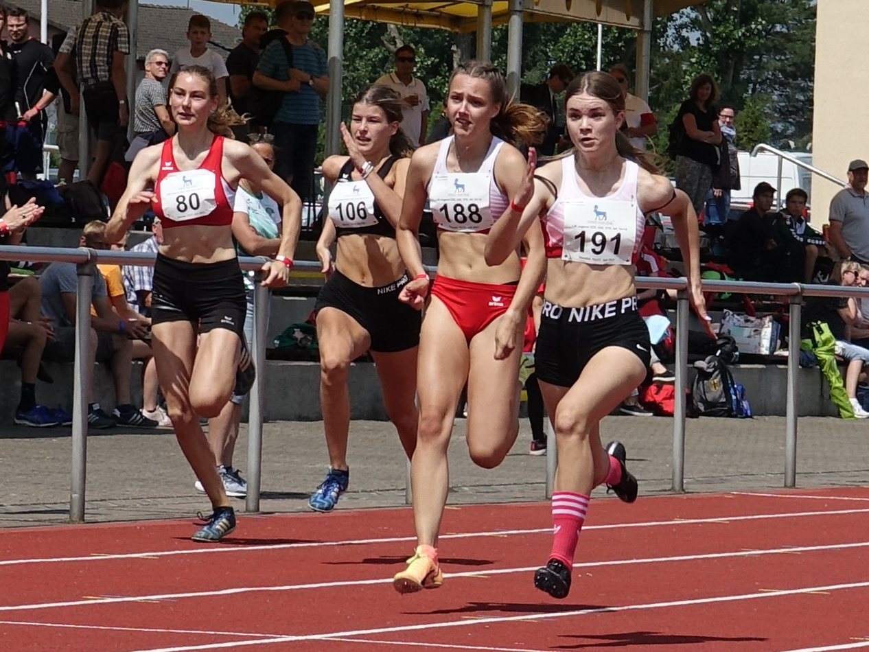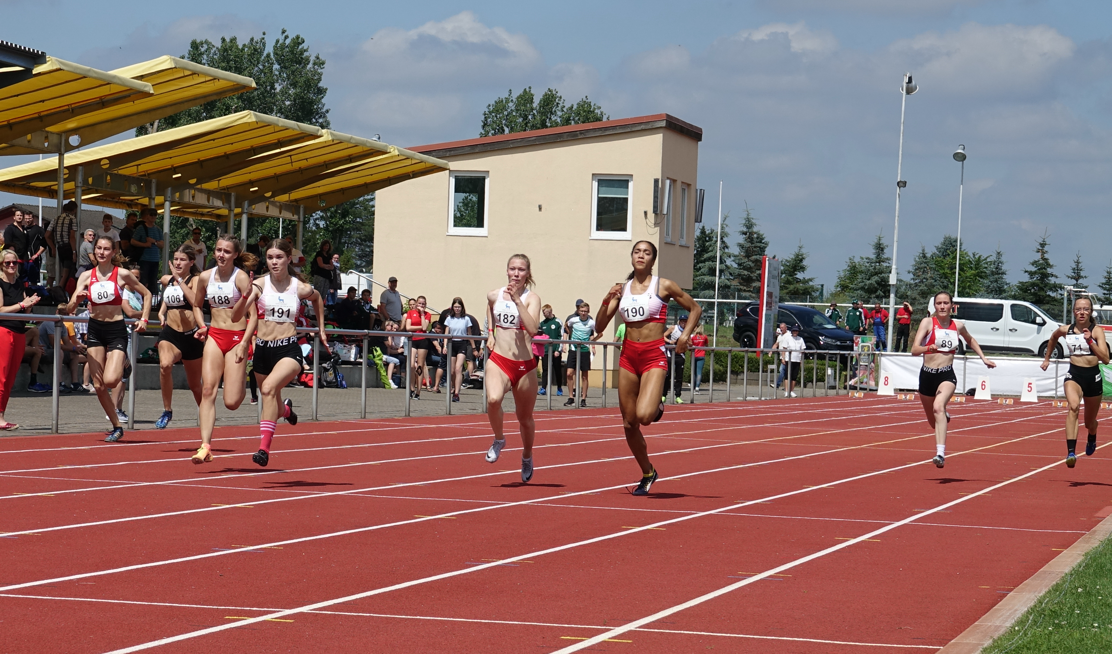 Die Sprintläufe waren, wie eingangs erwähnt, am ersten Tag stark windunterstützt. So sprintete beispielsweise Henriette Lässing vom SV Halle über 100 m in der W15 sehr flotte 12,37 s (+5,1 m/s). In der W14 blieb die Uhr für Friederike Domann vom PSV Bernburg bei 12,93 s stehen (+4,5 m/s). Und auch in der weiblichen U18 wird die 100 m Finalzeit von Luna Nowack (SC Magdeburg), die 11,98 s (+2,8 m/s) auf die Bahn trommelte, nicht in die Bestenlisten Einzug halten.