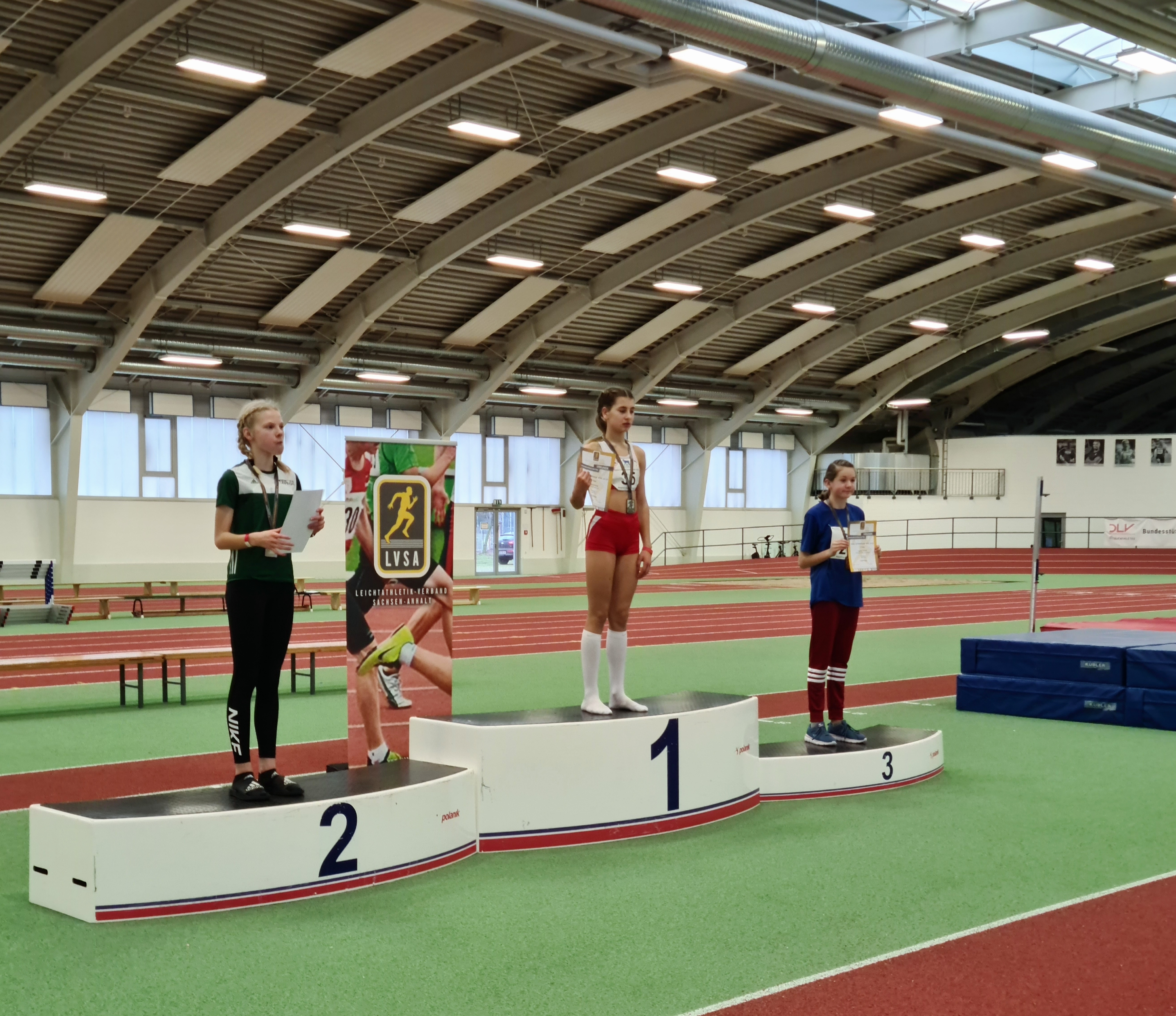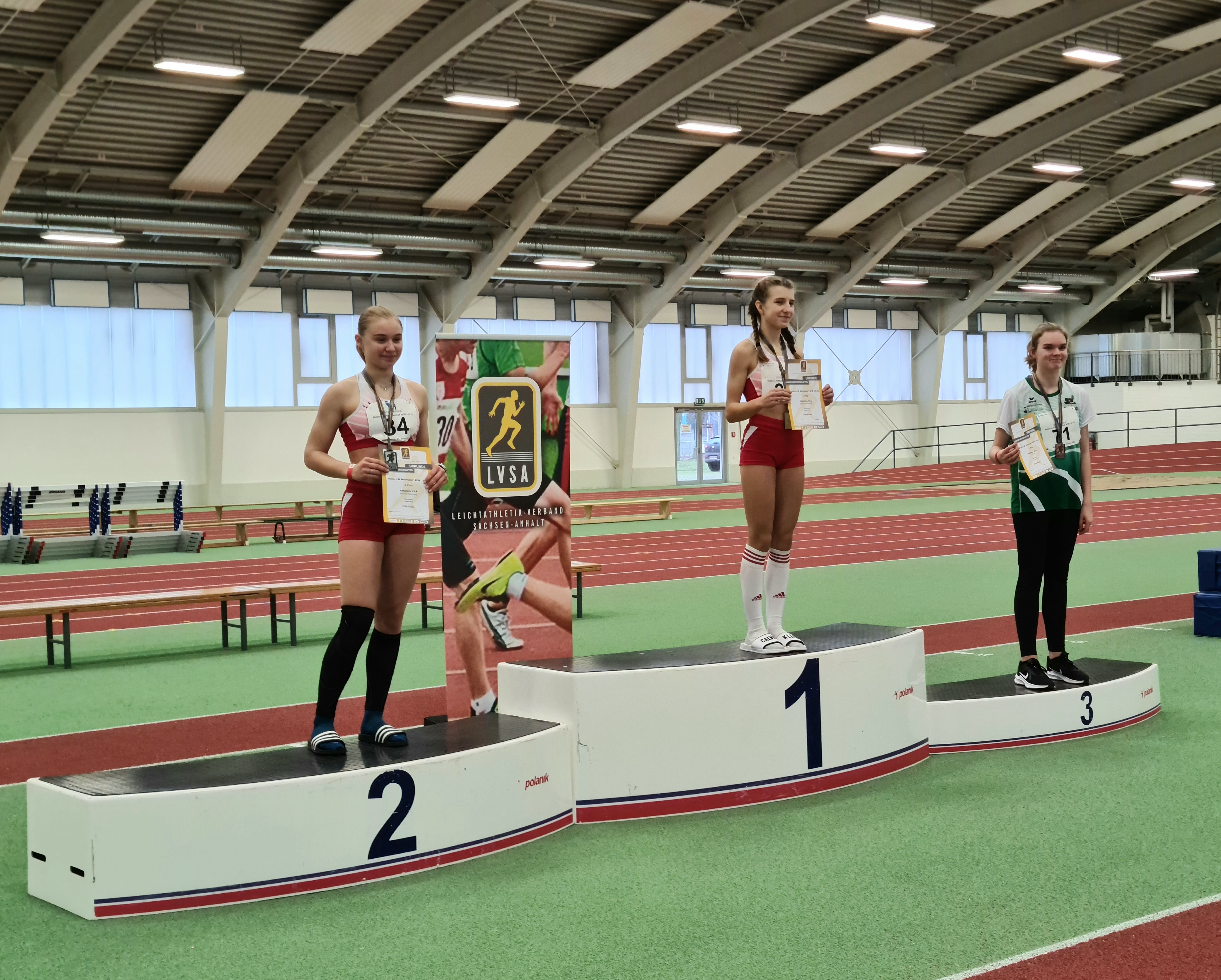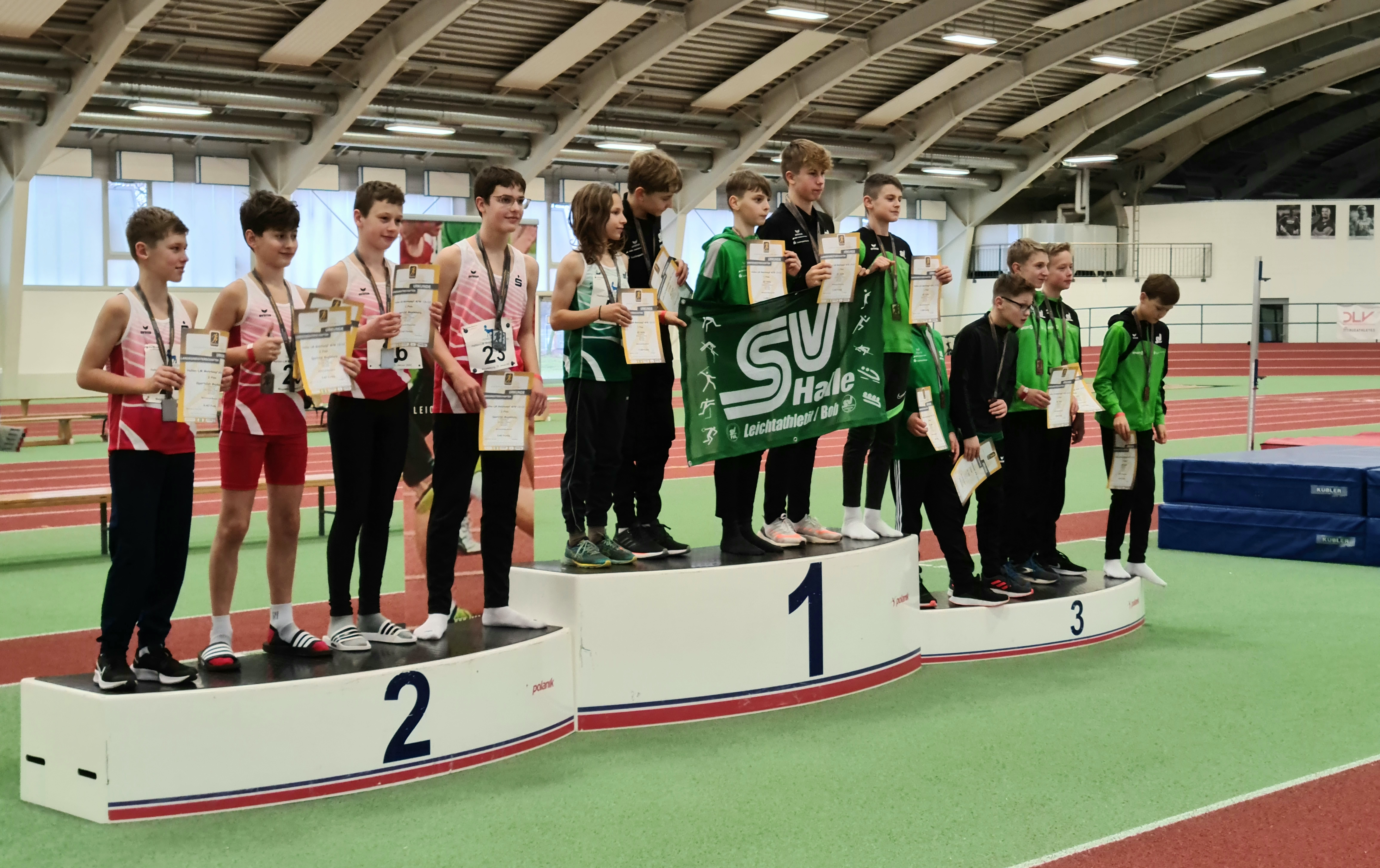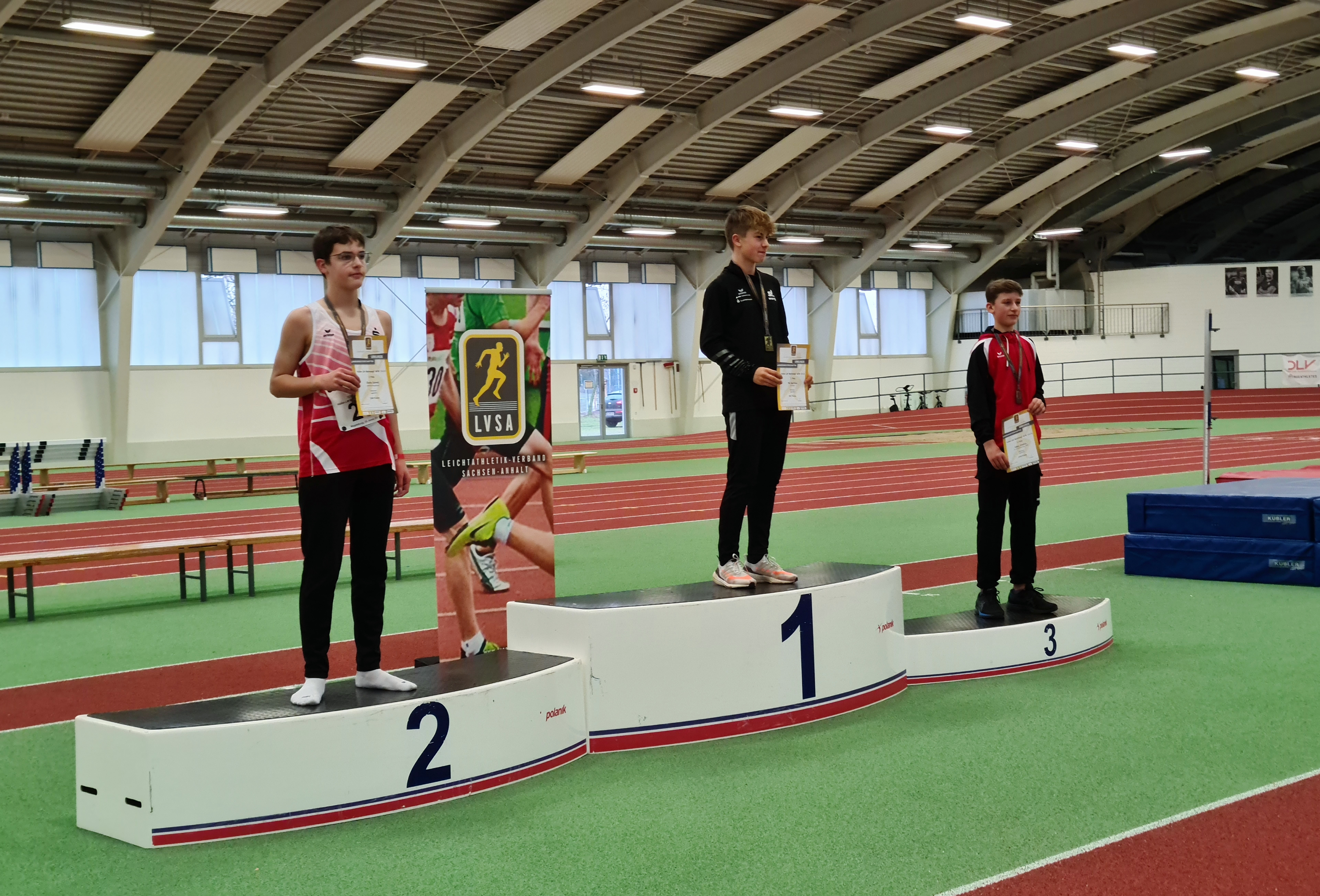 Auf dem neu sanierten Laufbelag war es auch gleich der ehemalige Dessauer, Phil Matthias vom SV Halle, der von sich Rede machte. Mit 2.581 Punkten zeigte er einen guten Mehrkampf in der M13 und glänzte vor allem über die 60 m Hürden in 9,02 s und dem 60 m Sprint, in dem er eine 7,78 s auf den neuen Untergrund trommelte. Auf dem zweiten Platz kam Charlie Behrnd vom SC Magdeburg mit 2.204 Punkten. Er überzeugte u.a. im Kugelstoßen. Seine 3,0 kg Kugel landete hier bei 9,03 m. Auf dem dritten Rang wurde Niklas Stephan vom SV Lok Blankenburg gefeiert. Er erzielte 2.195 Punkte und lieferte sich insbesondere auf der abschließenden 800 m Distanz einen spannenden Kampf mit Phil Matthias.