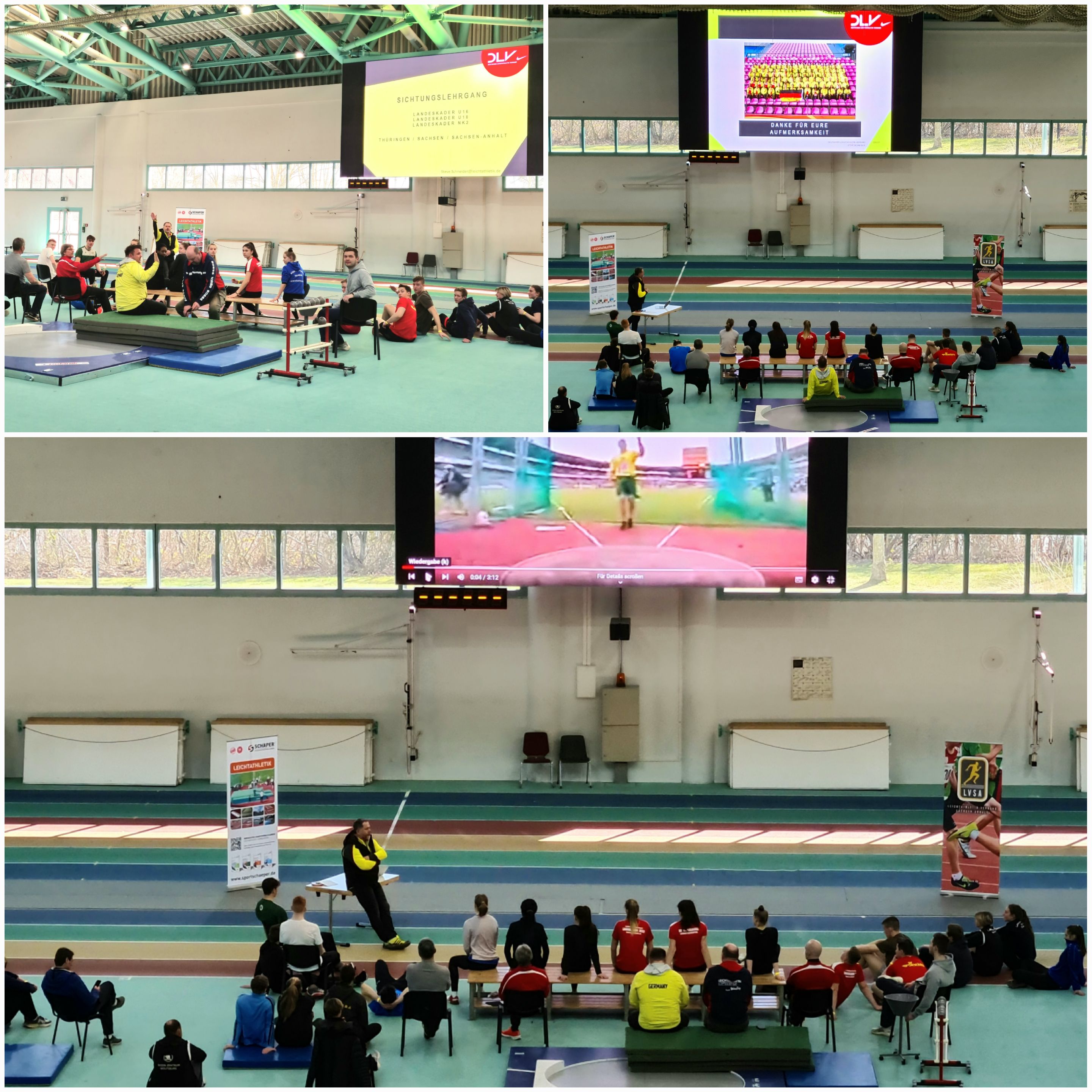 Insgesamt begrüßten die Organisatoren des LVSA sowie die Nachwuchsbundes/Trainer rund 20 Sportler*innen, die teilweise mit ihren Heimtrainern oder Eltern angereist waren. Zwischen dem Vormittags- und Nachmittagsprogramm nutzte der verantwortliche DLV-Nachwuchsbundestrainer Wurf/ Stoß Steve Schneider die neue Anzeigetafel und Beschallungsanlage in der Brandbergehalle, um den jungen Athleten*innen u.a per Youtube Videos einen Motivationsschub für die verschiedenen Wurf- und Stoßdisziplinen zu vermitteln. Darüber hinaus sprach er über anstehende internationale U18 ff. Meisterschaften und den Weg, den es mittel- und langfristig zu beschreiten gilt, um im Kontext des langfristigen Leistungsaufbaus eventuell bestehen zu können.