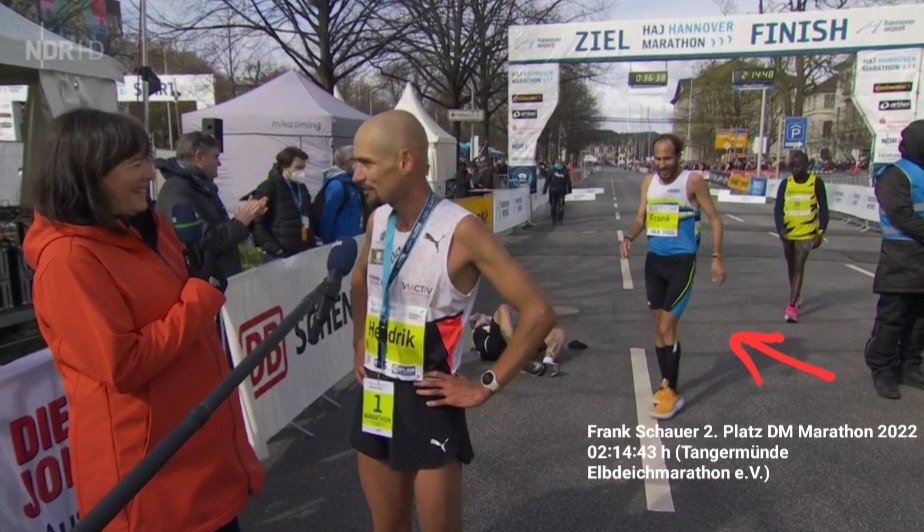 Am 03. April 2022 fand im Rahmen des Hannover-Marathons die Deutsche Meisterschaft im Marathon statt. Frank Schauer vom Tangermünder Elbdeichmarathon e. V. nutzte die "kühlen aber dennoch guten Straßenlaufbedingungen und spurtete auf den letzten Metern in 02:14:43 min sogar noch auf Rang 2. Henrik Pfeiffer (TV Wattenscheid) wurde in 02:10:59 h Deutscher Meister. Damit fehlen Frank nur 13 Sekunden zur offiziellen Marathon-EM-Norm für München 2022.