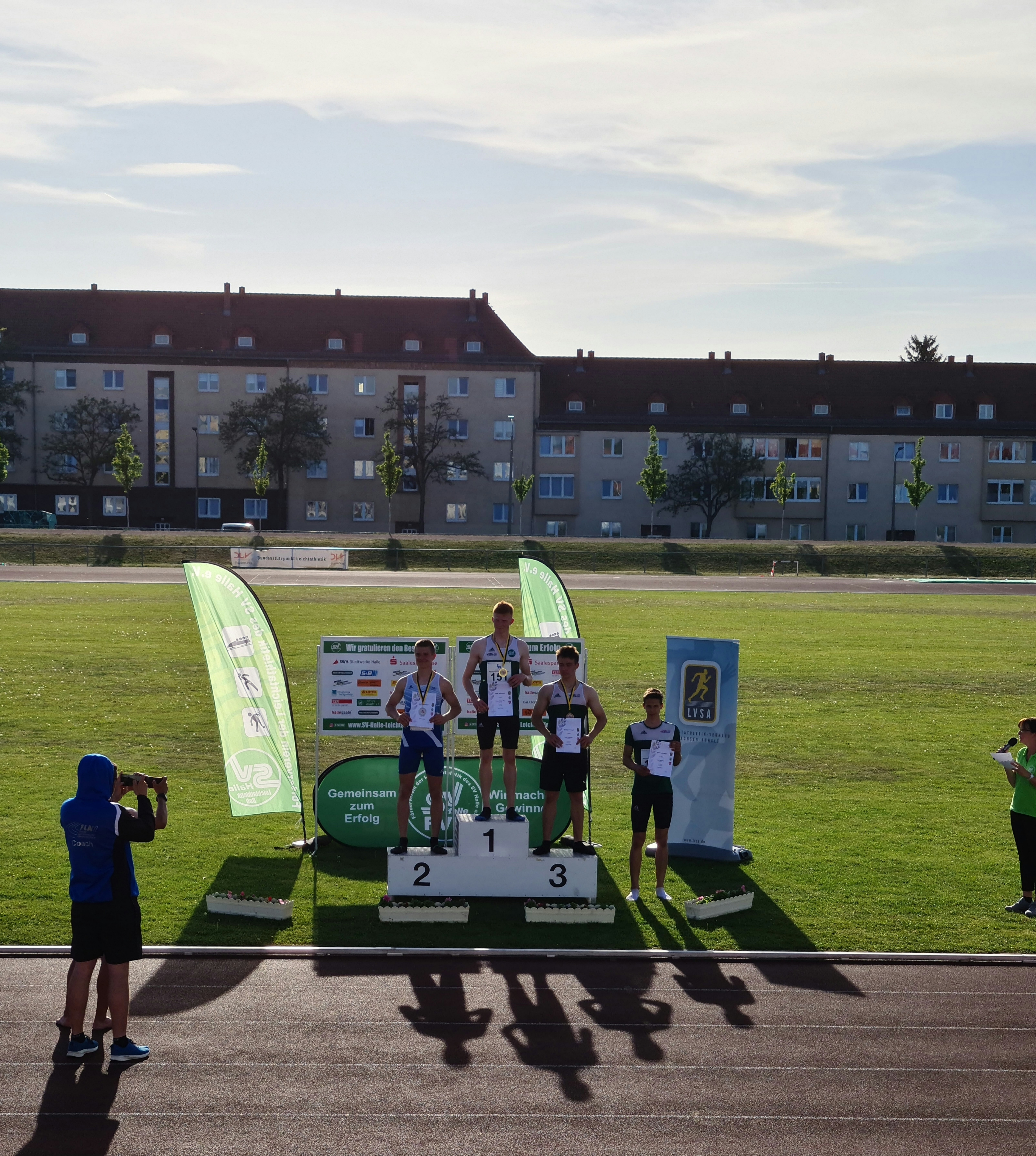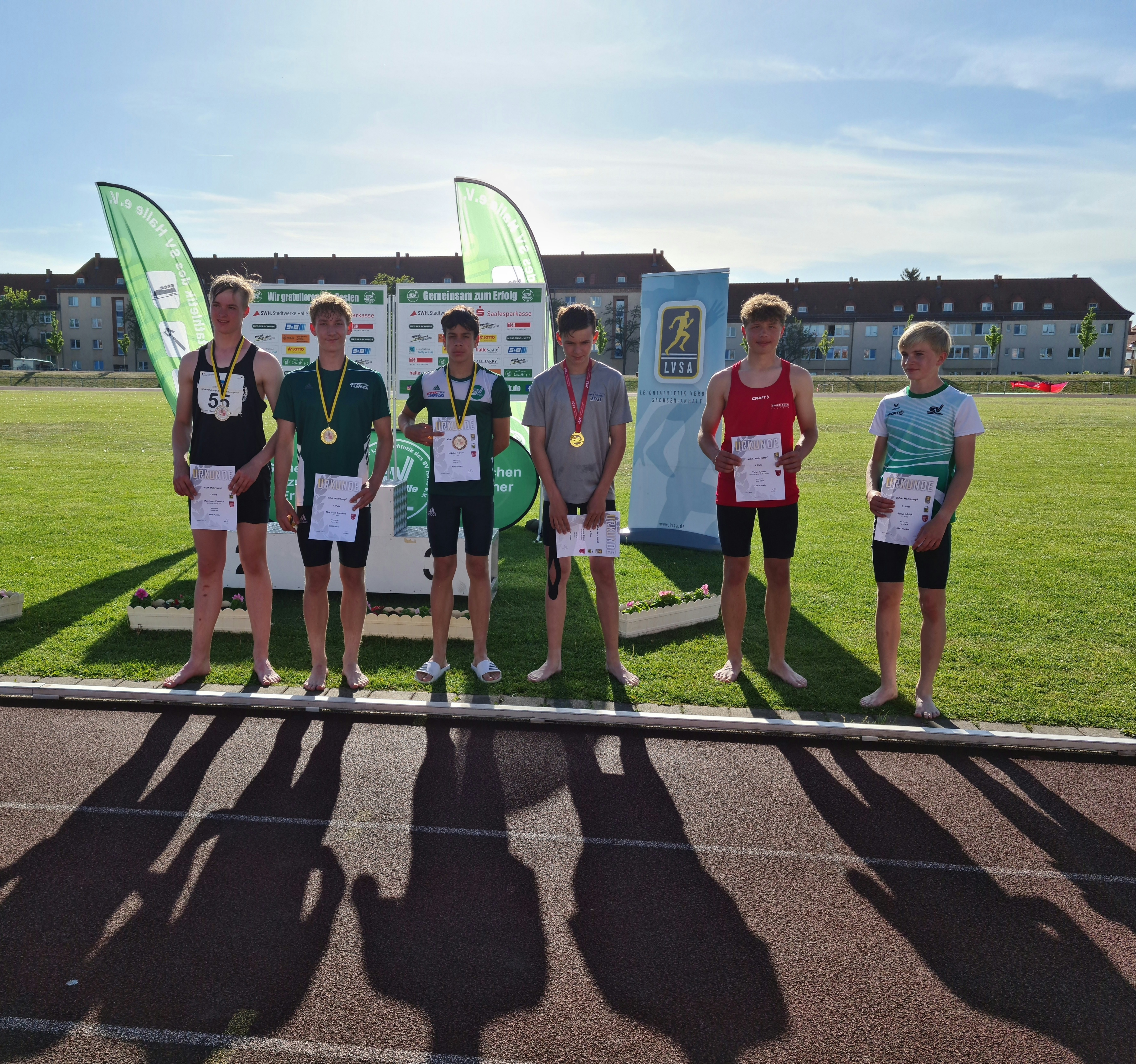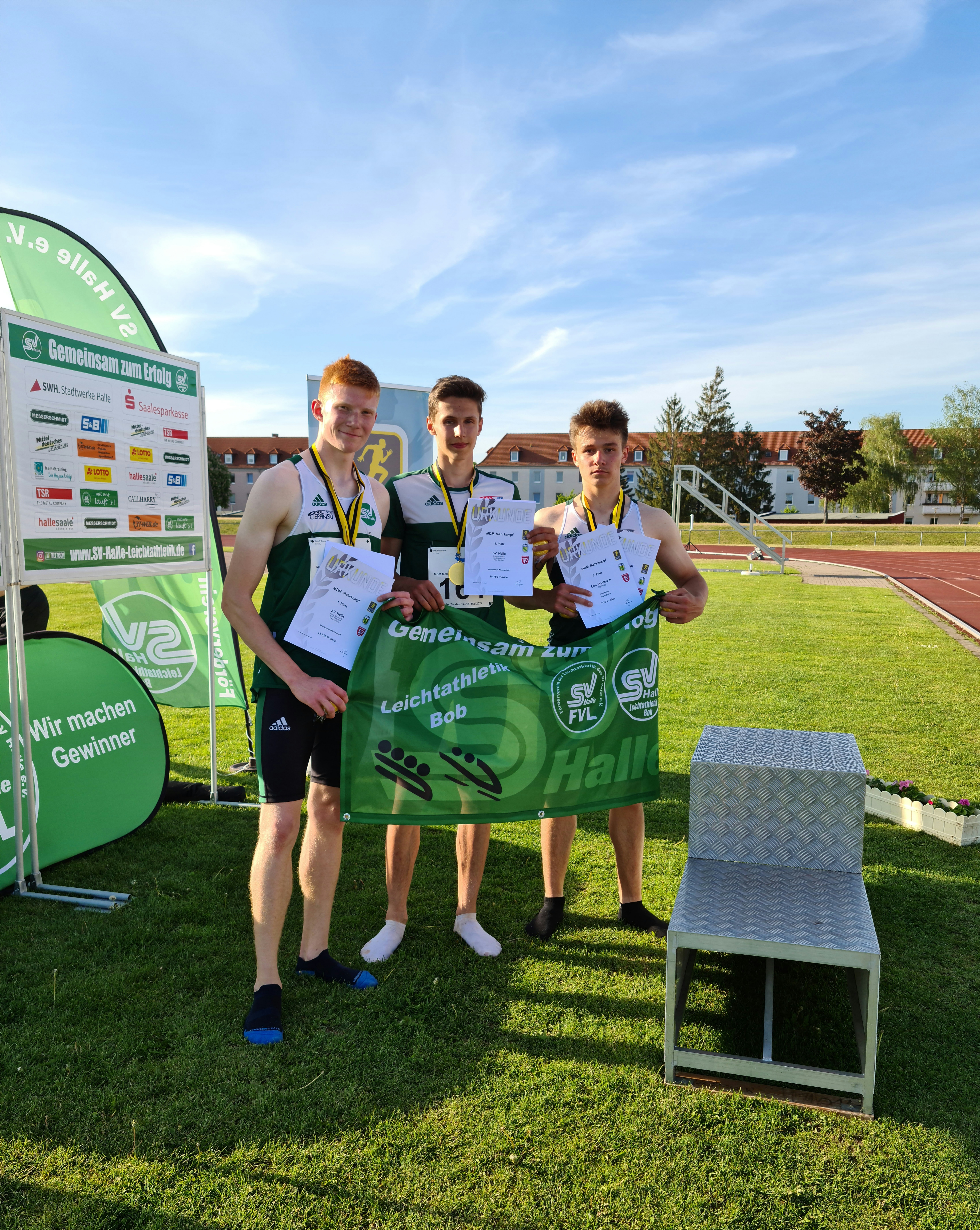 Im Neunkampf der M15 sorgte gleich ein ganzes Quartett für Spannung, Spaß und gute Leistungen. Allen voran zeigte Ernst-Bruno Eltz (SV Halle), was in ihm schlummert. Mit 6,62 m im Weitsprung oder 1,80 m im Hochsprung setzte er bereits am ersten Wettkampftag ein Zeichen. Er wurde schließlich mit 5.434 Punkten Mitteldeutscher Mehrkampfmeister. Der 2. Platz ging mit 5.362 Punkten an Anton Steffen vom 1.LAV Rostock, der vorallem mit 55,13 m im Speerwurf sein Können präsentierte. Der Kampf um Platz 3 war bis zur letzten Disziplin ein enges Kopf an Kopf Rennen zwischen Paul Günther und Emil Wydmuch (beide SV Halle). Schließlich setzte sich Emil mit einem couragierten 1.000 m Lauf mit knapp vier Zehntel vor Paul durch, was in der Endabrechnung zwei Punkte ausmachte. Mit 5.162 Punkten und einem weiten Diskuswurfsatz von 47,17 m freute er sich über die bronzene Plakette. Platz vier ging damit mit 5.160 Punkten und u.a. mit einer neuen Stabhochsprung Bestleistung von 3,50 m an Paul Günther. Die jungen Mannen stellten im Gesamtklassement einen neuen "Deutsche Rekord" in der Mannschaftswertung der MU16 auf. Der liegt nun bei 15.756 Punkten.