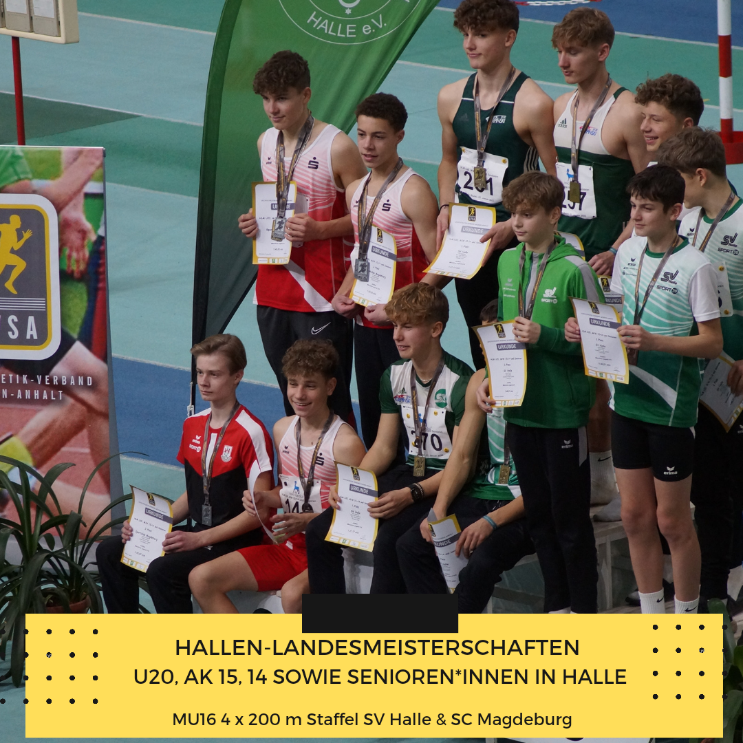 In der weiblichen AK 14 siegte Marlene Sack vom SV Halle mit 29,63 m vor den beiden Schönebecker Damen Antonia Steinecke (27,20 m, Union 1861 Schönebeck) und Klaara Heim (24,69 m). Den Abschluss des Wettkampftages bildeten die 4 x 200 m Staffeln. In der weiblichen U16 präsentierten die SV-Halle Athletinnen Hannah Kaczmarek, Stella Hoffmann, Hannah Weinrich und Helene Müller in 01:47,27 min eine flotte Staffelzeit. In der männlichen U16 siegten die jungen Mannen um Phil Matthias, Max Leon Graichen, Max Sven Ferber und Nikolas Tietze vom SV Halle in 01:37,17 min.