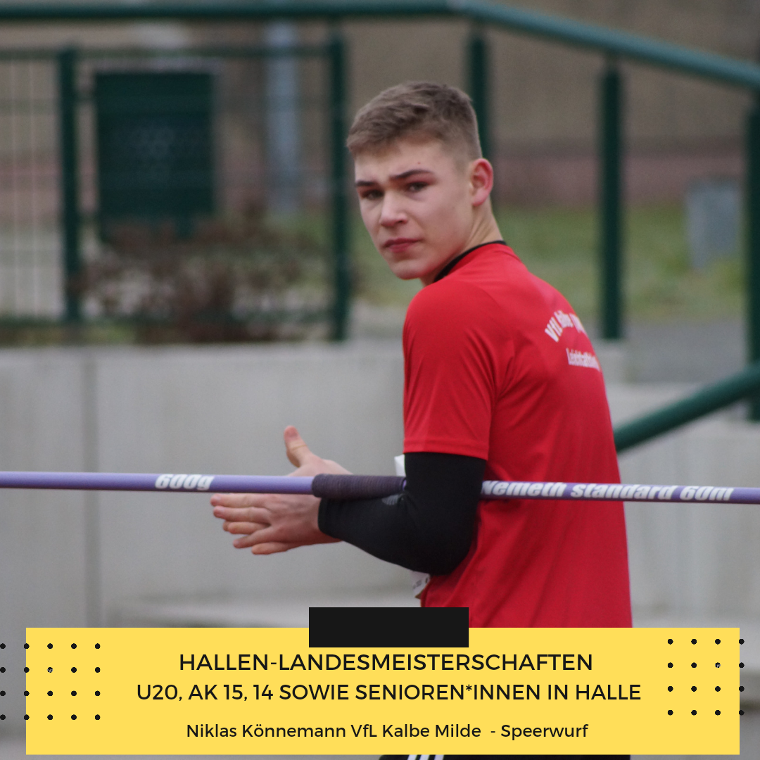 Trotz frostiger Temperaturen gewann das Speerwerfen der 15-Jährigen Männer Niklas Könnemann vom VfL Kalbe Milde unbeirrt mit 50,41 m vor Max Sven Ferber (SV Halle; 43,56 m) und Paulo Röthling (SV 1885 Teutschenthal / WLT) mit 43,31 m. In der M14 freute sich Louis Schulze vom SC Magdeburg über 44,18 m als auch seinen Landesmeistertitel im Speerwurf. Max Hasse und Karl Magnus Heidecke (alle SC Magdeburg) folgten auf den Plätzen zwei und drei mit 40,48 m und 36,09 m. Das Diskuswerfen wurde ebenfalls von Loius Schulze gewonnen. Er beförderte sein Arbeitsgerät auf 35,54 m, vor Bruno Eppendorf von den Halleschen LA-Freunden (31,49 m) und Ole Witte vom Tangermünde LV 94 (30,98 m).