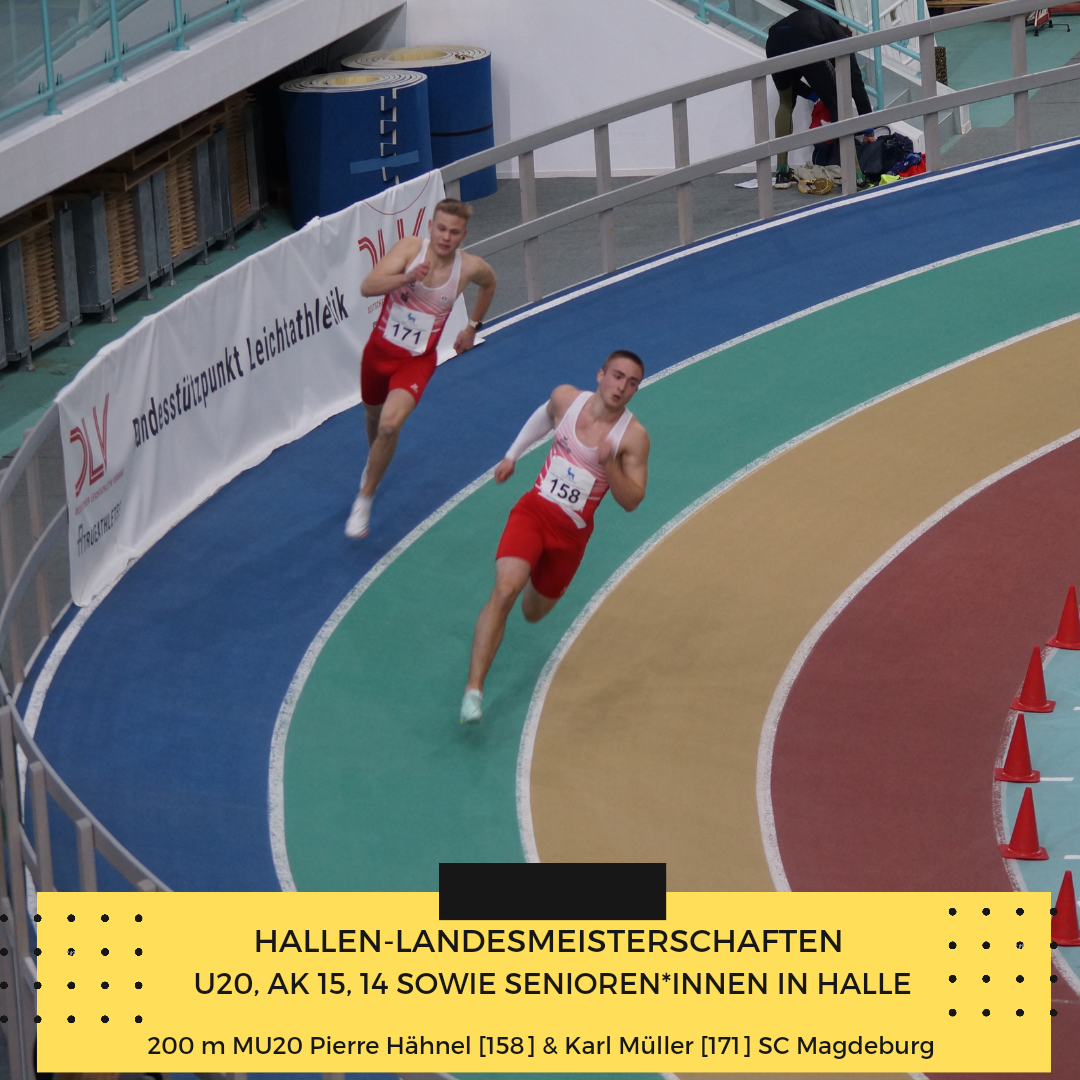 Die 200 m Rundbahn absolvierte Pierre Hähnel vom SC Magdeburg in der MU20 am schnellsten. Er benötigte 22,16 s vor Neu-Trainingspartner Karl Müller, der 22,77 s unterwegs war. Auf Rang drei sprintete Timor Linkohr vom MLV-Einheit (23,83 s). Den Landesmeistertitel der W15 über 60 m Hürden gewann wiederum Stella Hoffmann vom SV Halle. Sie benötigte 9,22 s. Auf dem zweiten Platz landete Louisa Friedrichs vom SC Magdeburg in 9,70 s vor Adana Specht vom 1. LAC Dessau (9,98 s). In der weiblichen Altersklasse 14 gewann diesmal Valentina Krug vom SC Magdeburg in 9,18 s vor Mimi Meinhard (SV Halle; 9,68 s) und Annabelle Lück (9,79 s).