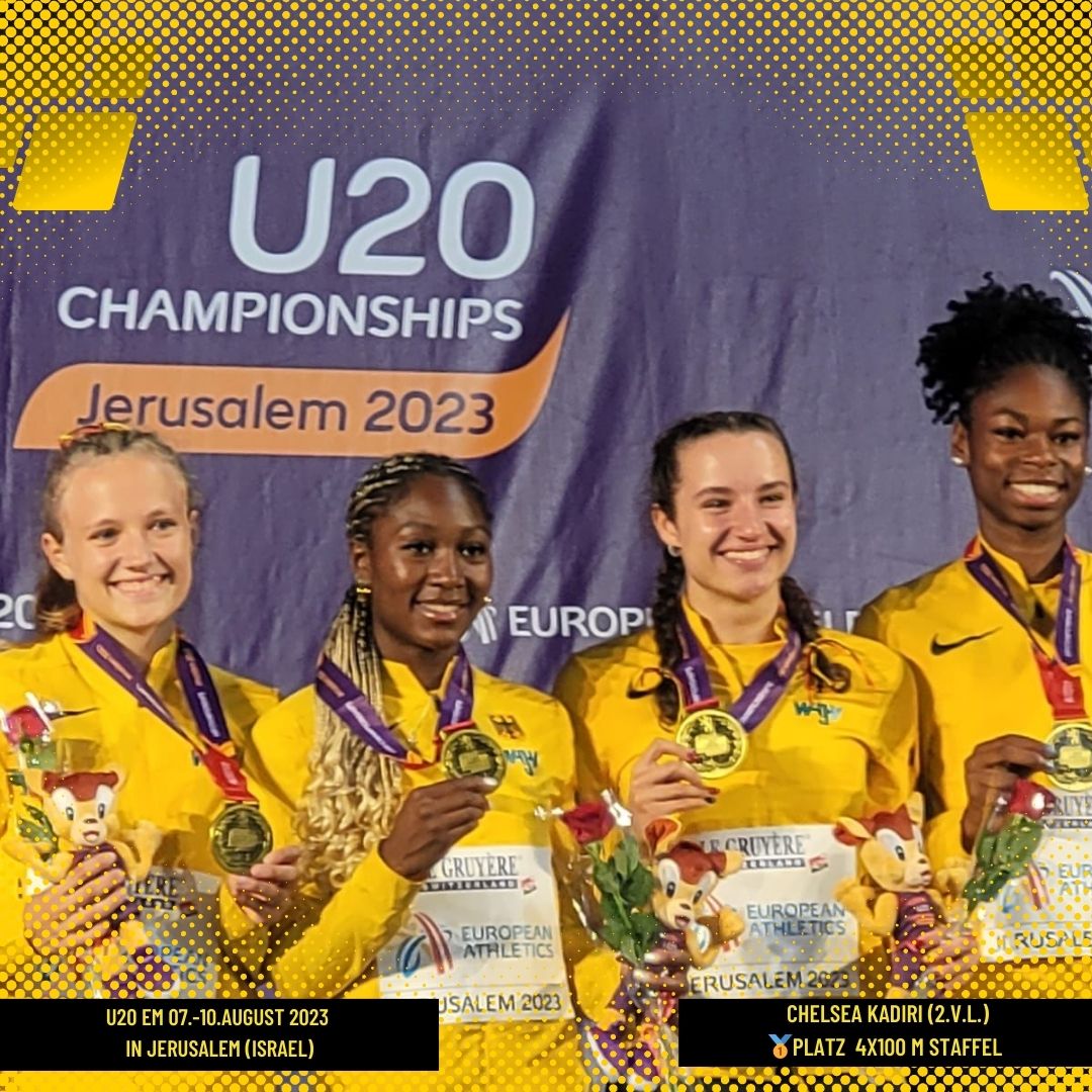 Eine Medaille steuerte hierbei Sprinterin Chelsea Kadiri vom SC Magdeburg mit der 4 x 100 m Staffel bei. Sie krönte sich am Abschlusstag in 43,82 s mit dem U20-Europameistertitel. Zuvor hatte sie über die 100 m in 11,55 s den undankbaren 4.Platz belegt. Lediglich der Hauch einer tausendstel Sekunde fehlten ihr auf das Podium. Allerdings muss auch erwähnt werden, dass sie noch dem jüngeren U20-Jahrgang angehört bzw. im Vorfeld der Meisterschaften bereits zur DM der Aktiven, bzw. der DM U20 ein Mammutprogramm in den Beinen hatte.