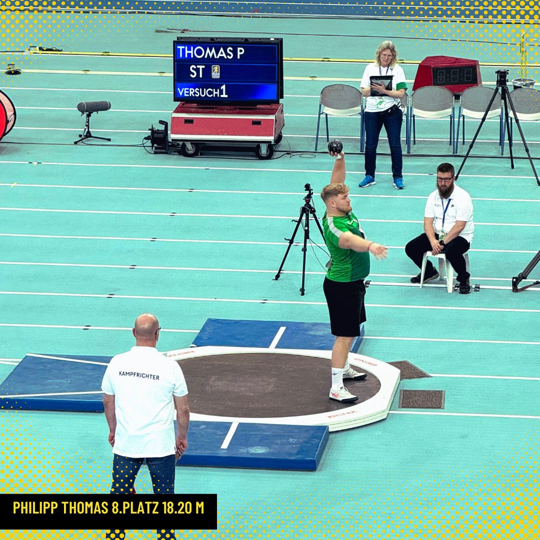 Sowohl im Livestream erkennbar als auch auf den Rängen vor Ort spürbar, fanden die beiden SV Halle Kugelstoß-Athleten Milaine Ammon und Philipp Thomas eine gut präparierte Wettkampfanlage vor, welche beiden zu jeweils einer Finalplatzierung verhalf. Mit persönlicher Bestleistung von 16,61 m belegte Frohnatur Milaine den 7. Platz; Philipp folgte mit soliden 18,20 m auf dem 8. Platz der Männer-Konkurrenz.