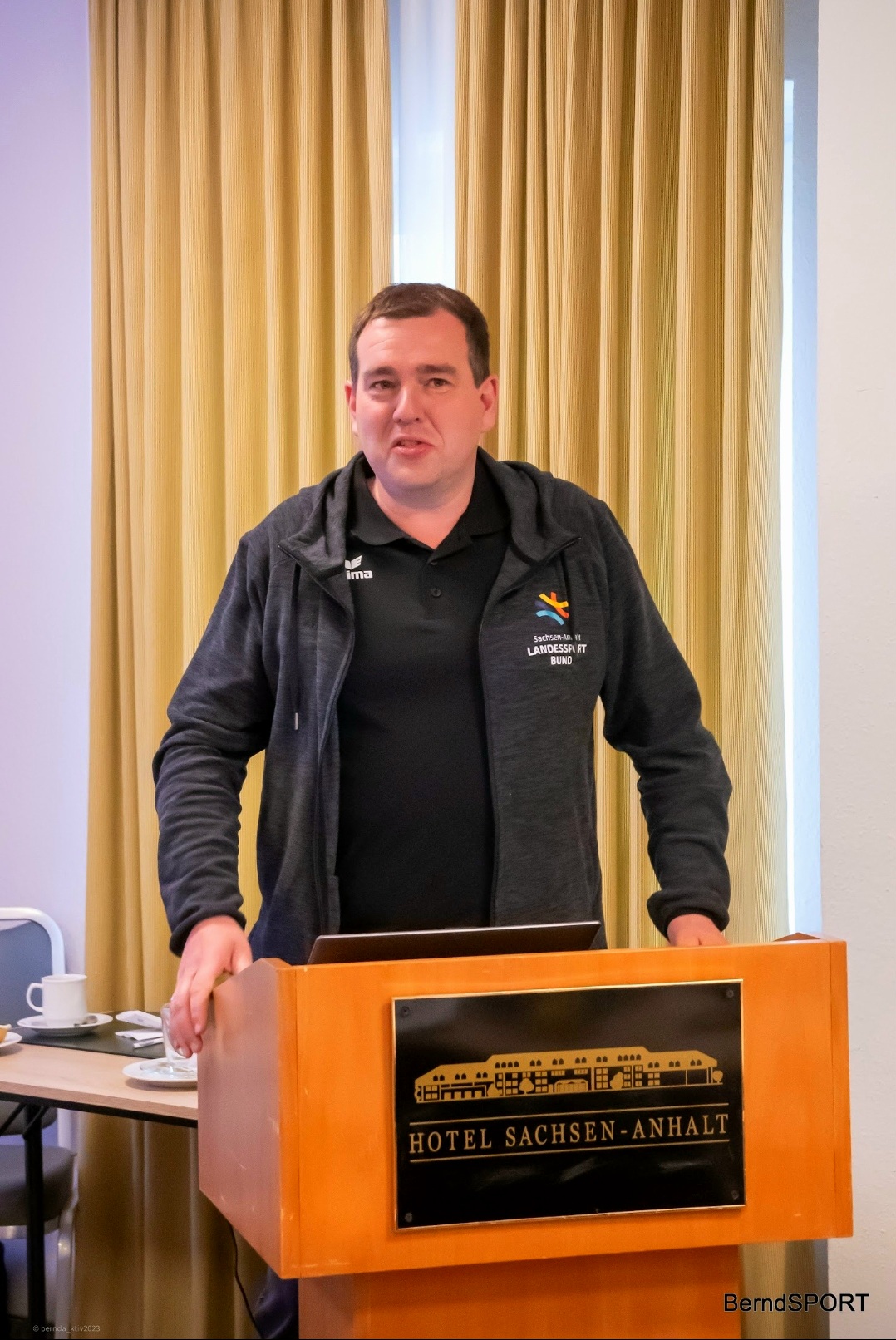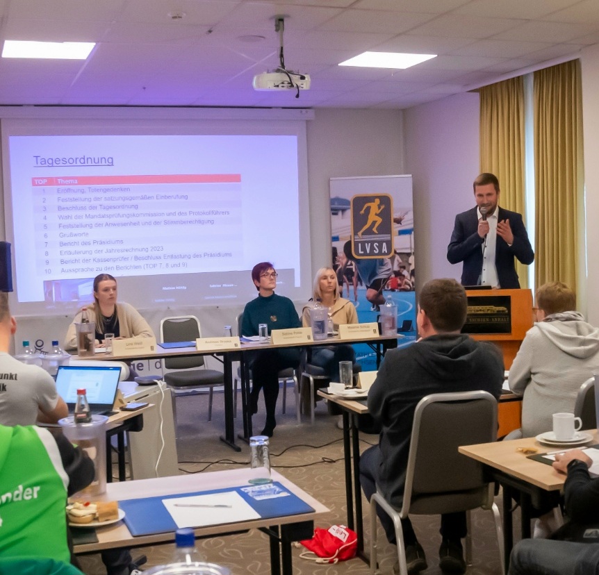 Anschließend folgten die Feststellung der satzungsgemäßen Einberufung der Veranstaltung, dem Beschluss der Tagesordnung, der Wahl des Protokollführers sowie der Mandatsprüfungskommission. Von Seiten des Landessportbundes Sachsen-Anhalt überbrachte Gastredner Dirk Meyer als Vizepräsident für Infrastruktur, Digitalisierung und Nachhaltigkeit Grußworte und lobte zudem die Zusammenarbeit sowohl mit den Vereinen des Leichtathletik-Verbandes als auch dem Verband selbst.