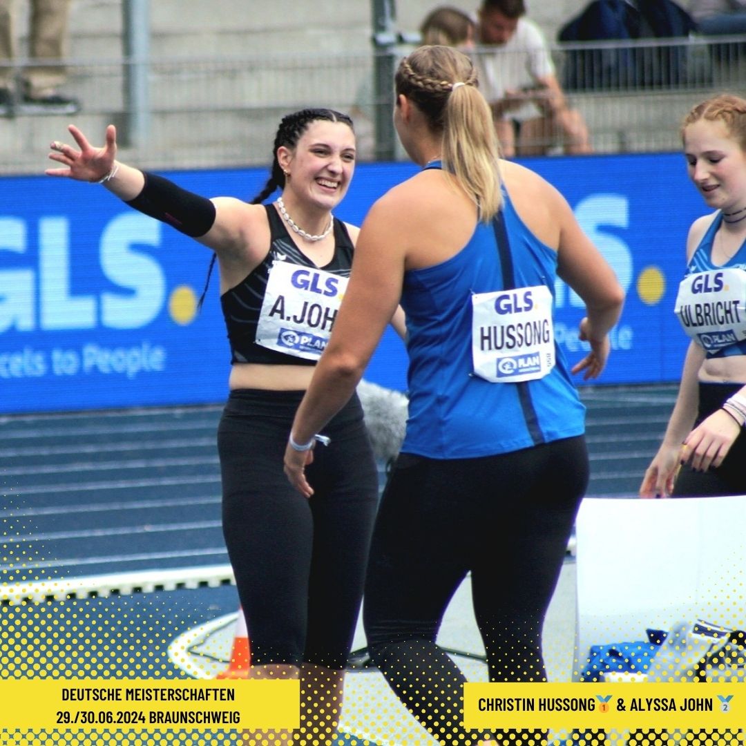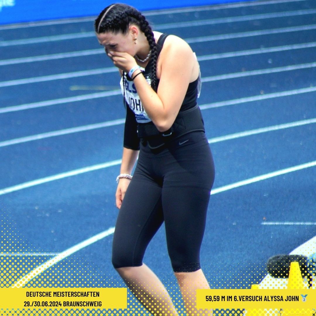 Einen emotionsgeladenen und spannenden Speerwurfwettkampf bot Alyssa John (SC Magdeburg). Von den Reportern als Underdog gehandelt, lehrte sie nicht nur diesen, warum man stets bis zum letzten Versuch abwarten sollte - 59,59 m im 6. Versuch, nach zuvor für sie vier mäßigen Anläufen und Weiten und einem weiten, aber ungültigen Versuch, zeigten um ihre neu hinzu gewonnene mentale Stärke. Das Christin Hussong (LAZ Zweibrücken) Speerwerfen kann, bewies auch sie mit ihrem letzten Versuch und 60,53. Damit war die bekannte Rangordnung hergestellt, wenngleich Alyssa ihren Vizemeistertitel, wie einen 1. Platz genoss.