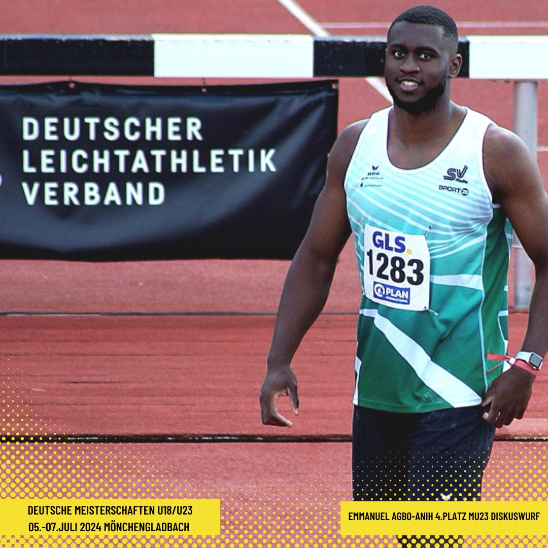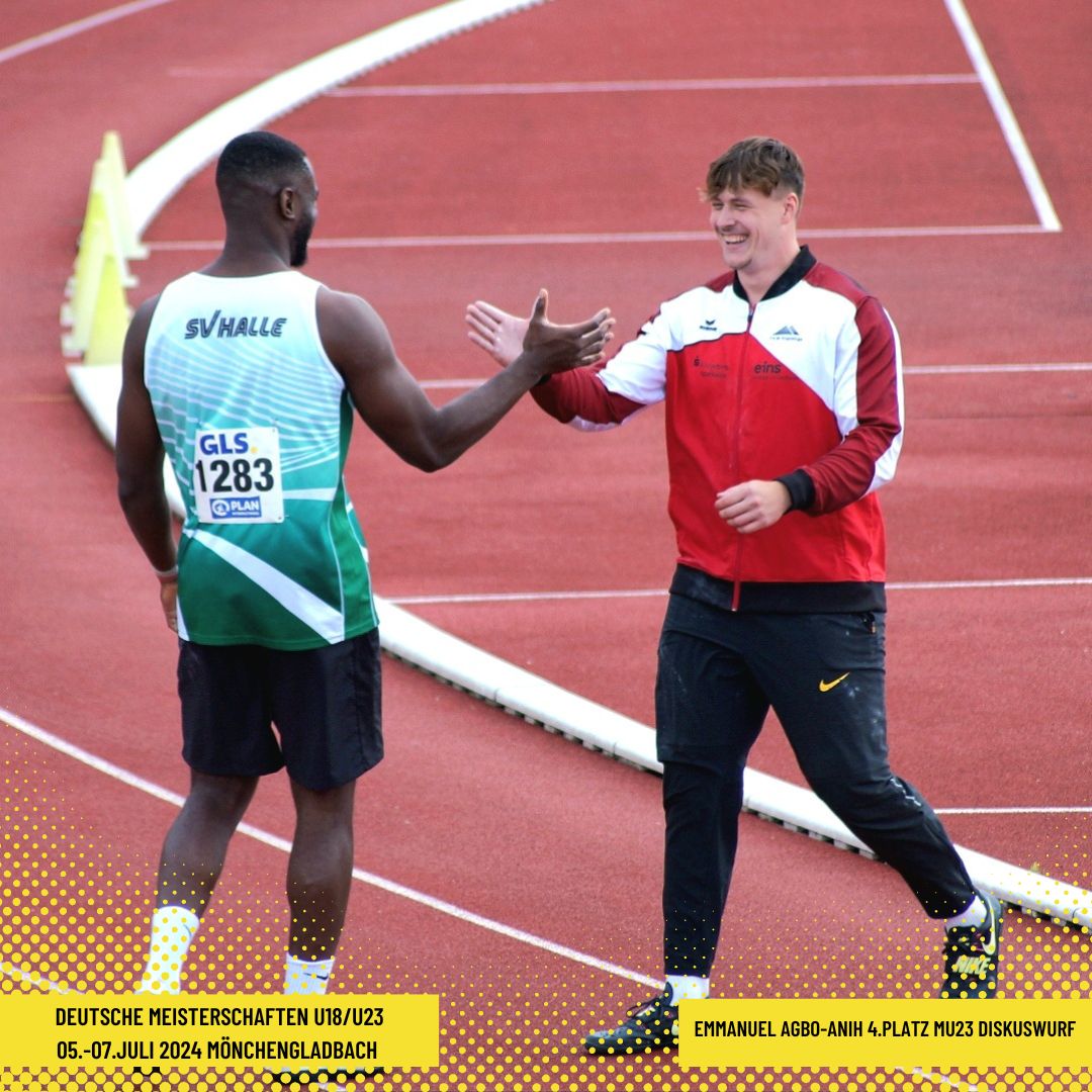 Im parallel stattfindenden Diskuswurfwettkampf der MU23 platzierte Emmanuel Agbo Anih vom SV Halle seinen 2,0 kg-Diskus auf eine neue Bestleistung von 57,86 m und sicherte sich in einem hochkarätigen Wettkampf Rang 4. Steven Richter vom LV90 Erzgebirge siegte mit starken 65,54 m.