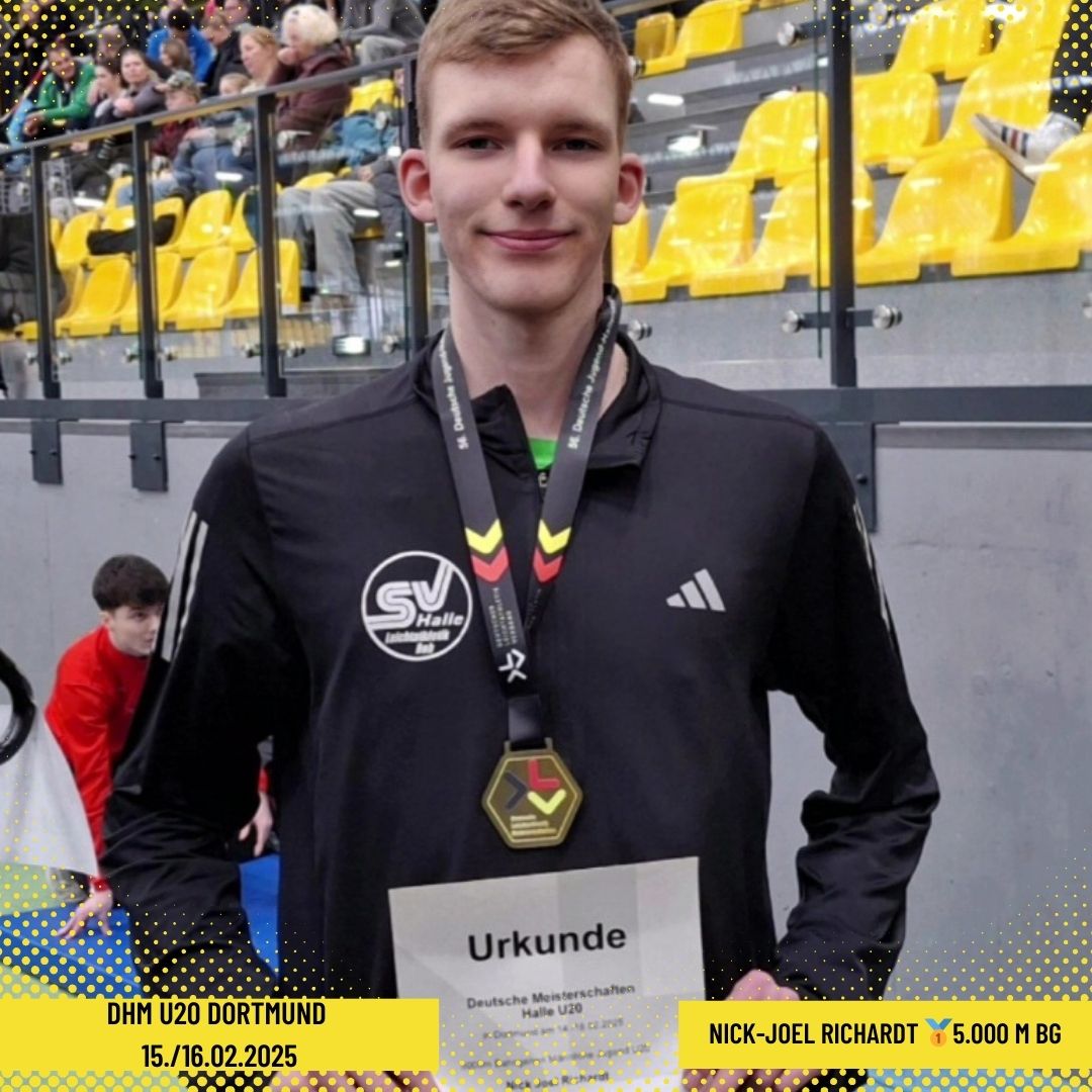 Traditionell starteten am Samstagmorgen die Bahngeher und -geherinnen den Wettkampftag. Und dieser wurde zur One-Man-Show von Nick-Joel Richardt vom SV Halle. Der zweimalige EYOF-Medaillengewinner und U20-WM-Teilnehmer siegte souverän in 20:21,99 min über die 5.000 m Bahngehen, zum dritten Mal in Folge. Eine Magendarmverstimmung bremste ihn hierbei sogar aus, sodass das Unternehmen Deutscher Hallenrekord, der bei 19:36 min liegt, nicht realisiert werden konnte (O-Ton s.u. www.leichtathletik.de vom 15.02.2025).