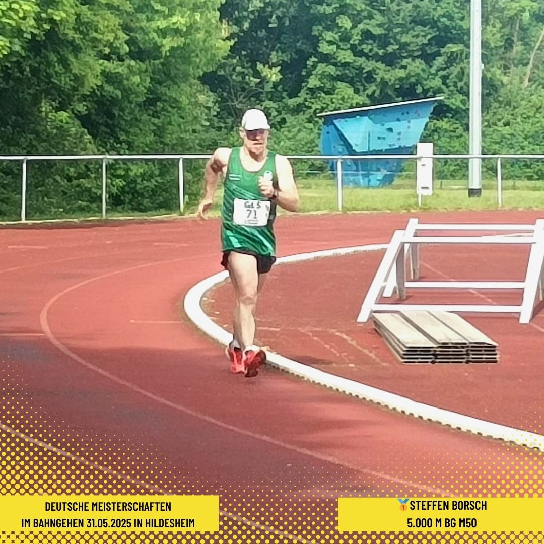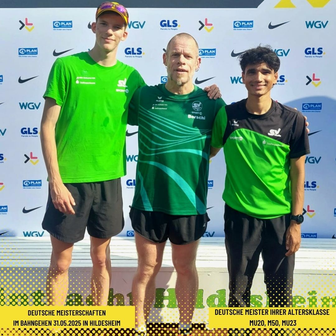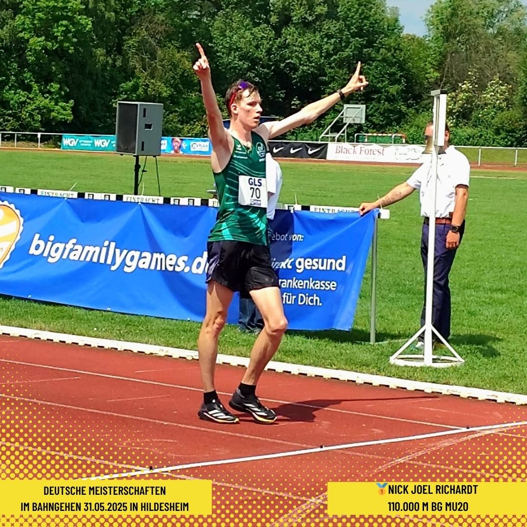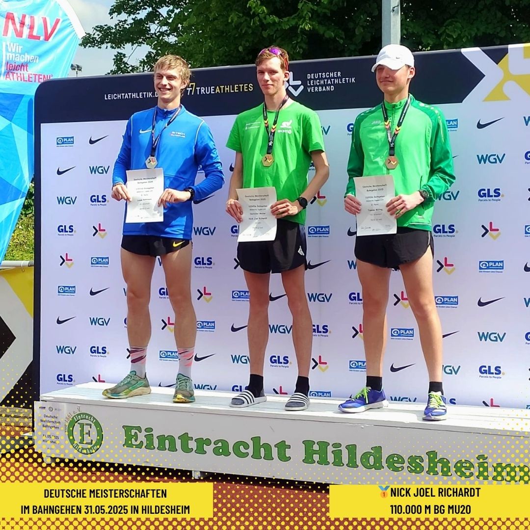 Am 31.05.2025 fanden die Deutschen Meisterschaften im Bahngehen in Hildesheim statt. Insgesamt hatten sieben LVSA-Athleten aus fünf Vereinen ihren Hut in den Ring geworfen. Und so ging es im wahrsten Sinne des Wortes unmittelbar und ohne Verzögerung erfolgreich mit Nick Joel Richardt vom SV Halle los. In 43:08,12 min siegte er souverän über 10.000 m BG in der MU20. In der nächst-höheren Altersklasse der MU23, war es anschließend einmal mehr Jassam Abu el Wafa (SV Halle), der die 10.000 m BG in 43:25,98 min als Deutscher Meister absolvierte.