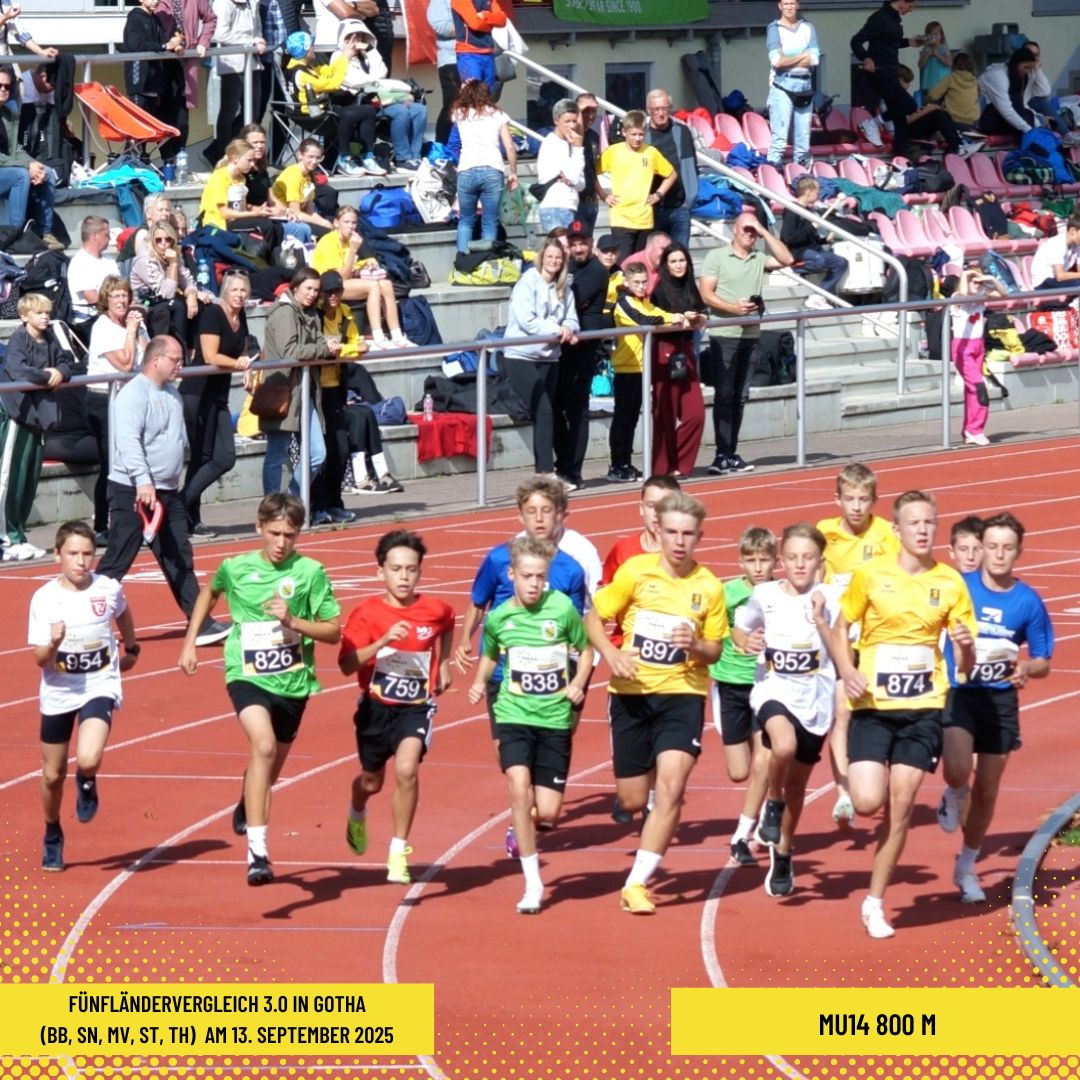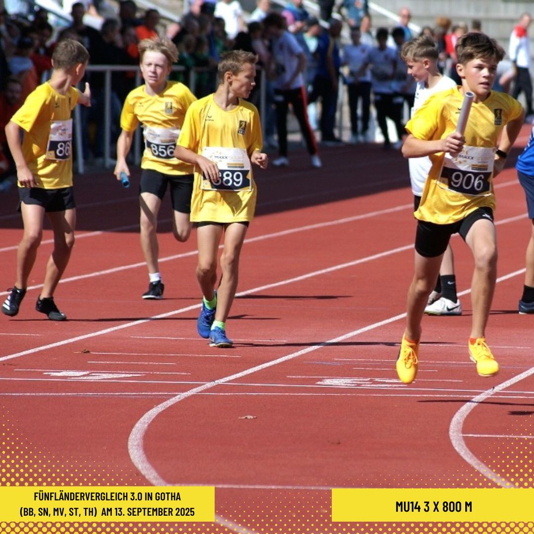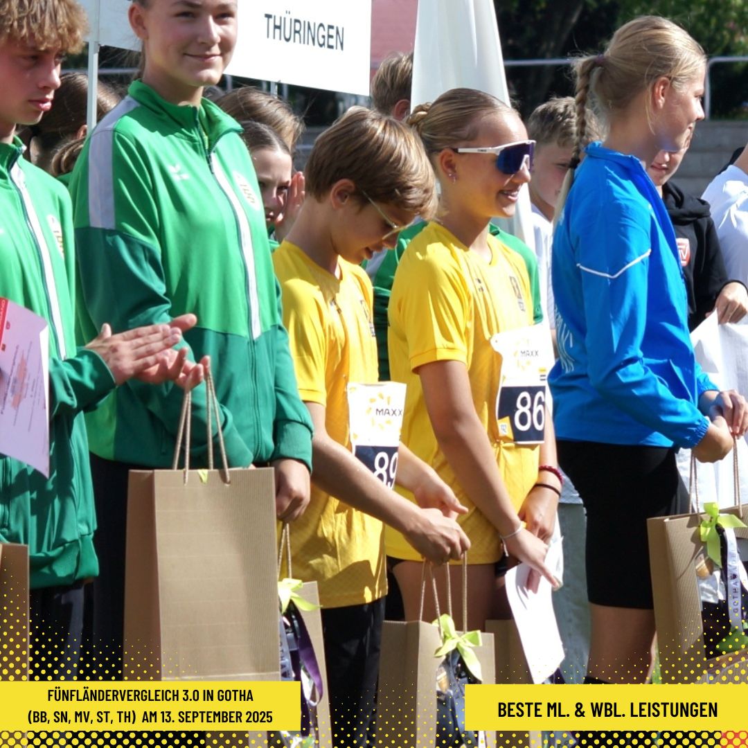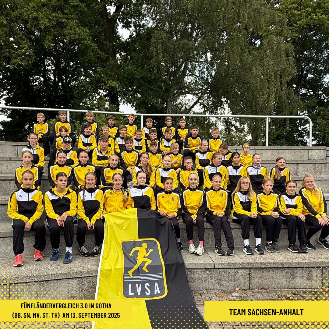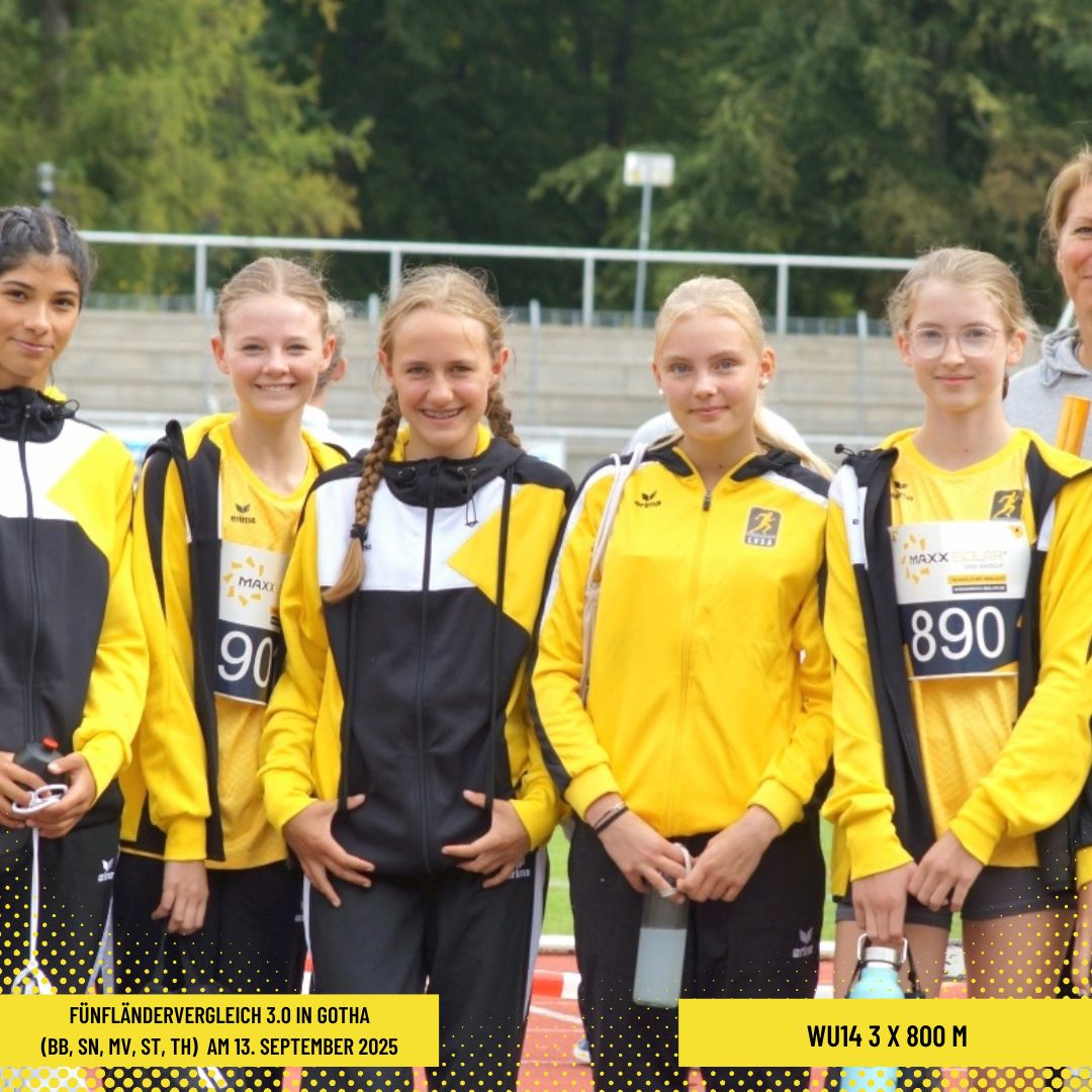 Am 13. September 2025 fand die 3. Auflage des U14-Fünfländervergleichs zwischen den Landesfachverbänden Brandenburg, Mecklenburg-Vorpommern, Sachsen, Thüringen und Sachsen-Anhalt, diesmal im Volksparkstadion in Gotha (Thüringen) statt. In den Mannschaften, die zwischen 35-55 Personen stark waren, stellten sich die besten 13- und 12-Jährigen ihrer zum Teil ersten großen, überregionalen Herausforderung. Und so kamen die rund 200 Athleten und Athleteninnen in einem kurzweiligen Wettkampfformat zusammen, welches neben der eigentlichen sportlichen Leistung, eine Platz-Punkte-Wertung führte; ganz im Stile der Team-Europameisterschaften der Großen.