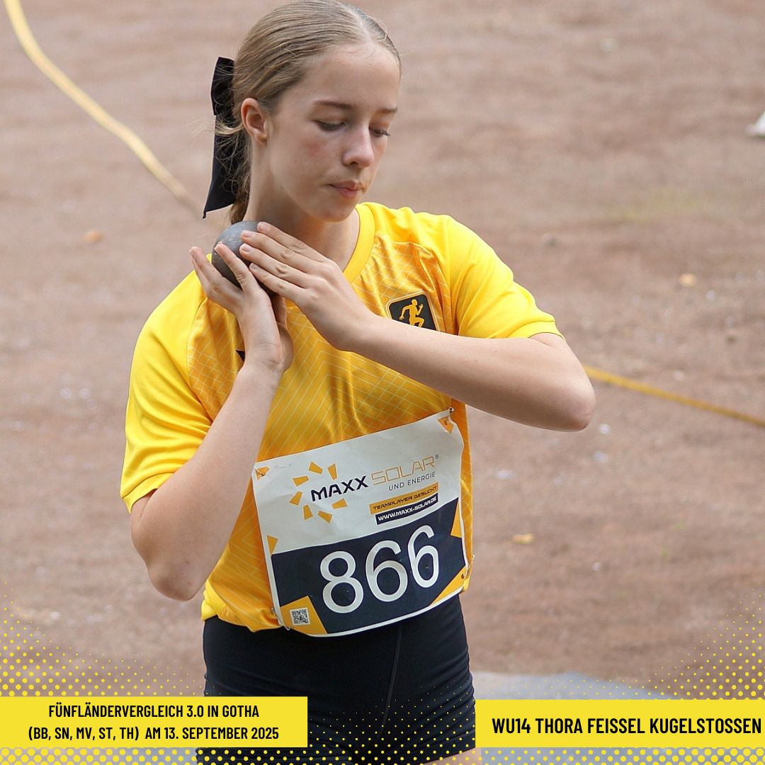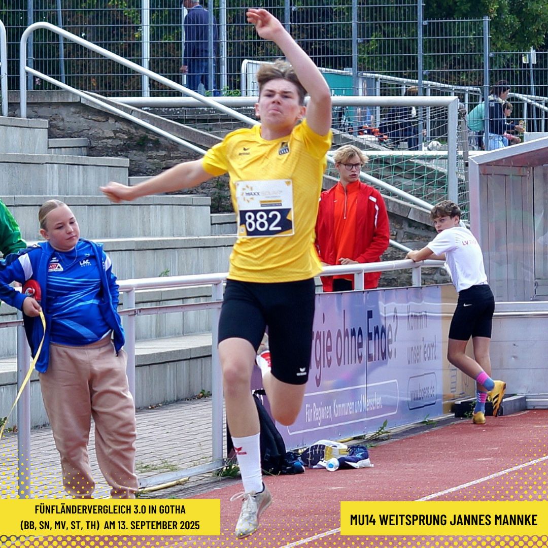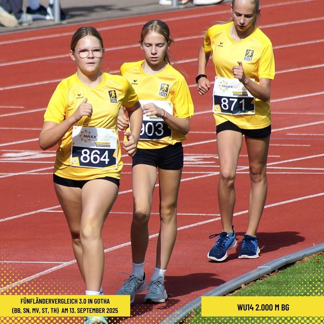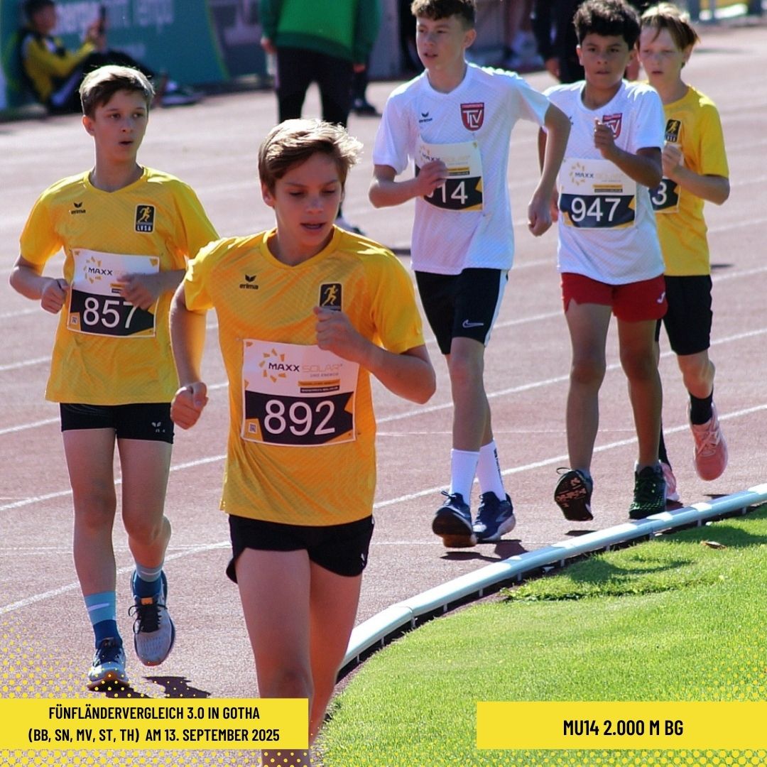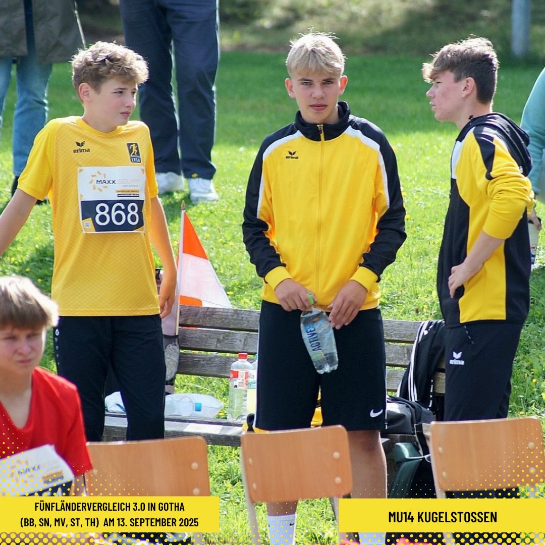 Am 13. September 2025 fand die 3. Auflage des U14-Fünfländervergleichs zwischen den Landesfachverbänden Brandenburg, Mecklenburg-Vorpommern, Sachsen, Thüringen und Sachsen-Anhalt, diesmal im Volksparkstadion in Gotha (Thüringen) statt. In den Mannschaften, die zwischen 35-55 Personen stark waren, stellten sich die besten 13- und 12-Jährigen ihrer zum Teil ersten großen, überregionalen Herausforderung. Und so kamen die rund 200 Athleten und Athleteninnen in einem kurzweiligen Wettkampfformat zusammen, welches neben der eigentlichen sportlichen Leistung, eine Platz-Punkte-Wertung führte; ganz im Stile der Team-Europameisterschaften der Großen.