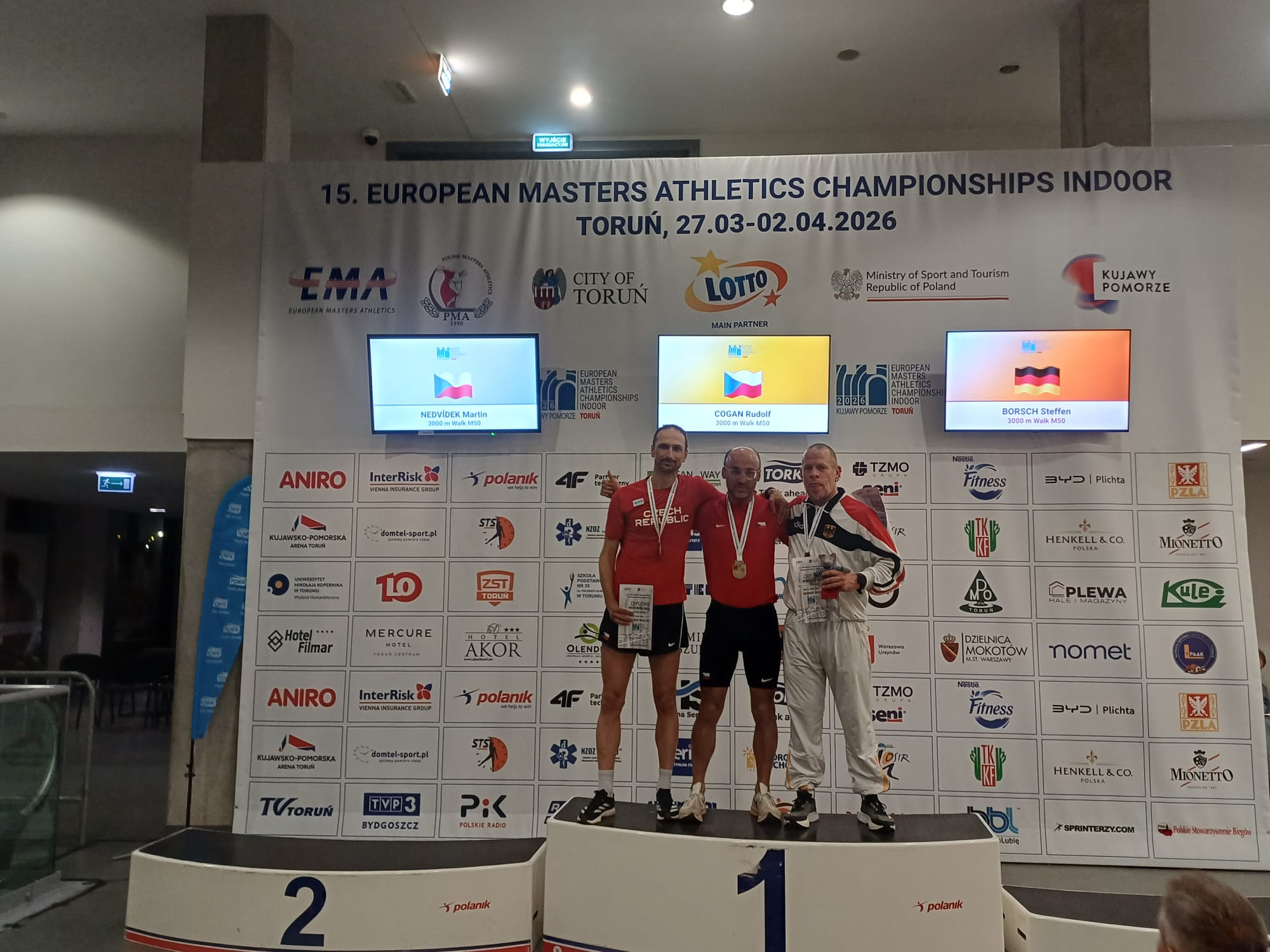 Das deutsche Masters-Team hat bei den Hallen-Europameisterschaften, welche vom 27.03. bis zum 02.04.2026 in Torun (Polen) stattfanden, den 1. Platz im Medaillenspiegel errungen. Die 21 Athleten und Athletinnen aus Sachsen-Anhalt trugen dabei einen großen Teil dazu bei. So errang u.a. Lothar Huchthausen (SV Rot-Weiß Arneburg) in der AK M90 in fünf Disziplinen jeweils den 1. Platz. Er warf den Diskus hierbei auf 18,30 m, den Hammer auf 22,36 m, der Speer landete bei 23,48 m, im Gewichtswurf standen 8,52 m zu Buche und die Kugel stieß er 8,41 m weit. Jenny Hase vom MLV-Einheit erkämpfte sich in der W35 sowohl im Diskuswurf mit 35,69 m als auch im Kugelstoßen mit 12,74 m die Silbermedaille. Julia Dreiling sprang in der W40 5,30 m im Weitsprung und belegte damit den Bronzerang. Des Weiteren konnte sie sich mit einem schnellen Lauf über die Hürden für das Finale in ihrer Altersklasse qualifizieren. Holger Fettke (M55) von Union 1861 Schönebeck erkämpfte sich im Hammerwurf mit 52,67 m und im Gewichtswurf mit 19,25 m den jeweils 3. Rang.