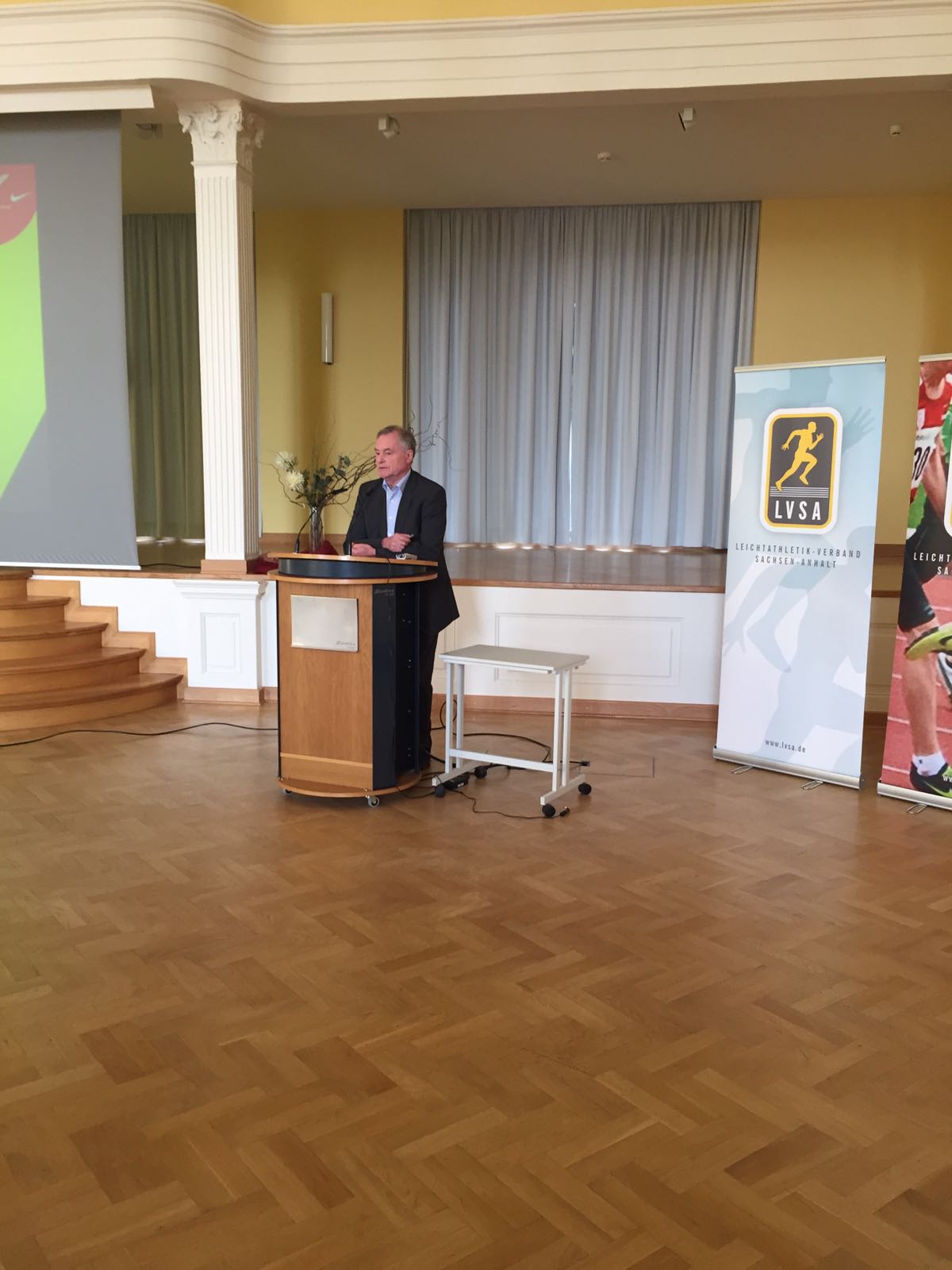 Prof. Dr. Grothkopp dankte im Namen des DLV allen Ehrenämtlern und Trainern für ihre großartige Einsatzbereitschaft und verwies in seinem Referat "Leistungssport im DLV, Erwartungen an den LVSA" auf die positive Entwicklung im Leistungssport in unserem Landesverband, Er ging kurz auf die internationale Dopingproblematik und die Strukturrefom beim DOSB ein.