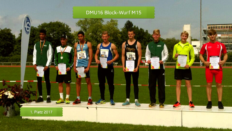 Ebenfalls vom SV Halle und gleichfalls den Deutschen Meistertitel erkämpfte sich Julien-Kelvin Clair im Blockwettkampf Wurf der M15. Er behauptete sich im Feld der 28 Mitstreiter mit 3.251 Zählern. Auf dem sechsten Platz landete hier Richard Hartmann (SV Halle) mit 3.047 Punkten.