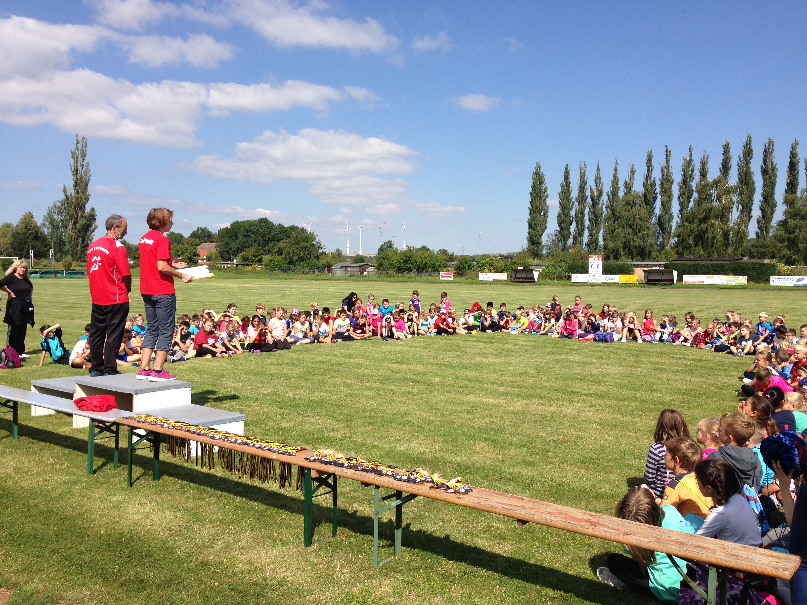 Wir, Sigrid Schwarz (Jugendwartin) und Lina Weiß (LVSA Jugend), waren am 23.08.17 zu Besuch in Eisleben. Auf dem Sportplatz des SSV Eisleben wollten sich 220 Kinder der Grundschule Geschwister Scholl zum zweiten Mal in der Kinderleichtathletik ausprobieren. Anstatt Mathematik und Deutsch standen Hindernissprintstaffel, Weitsprung-Staffel, Dreh- und Heulerwurf sowie Teambiathlon auf dem Plan. Zusätzlich konnten die Kinder der ersten bis vierten Klasse auch noch beim Stabspringen ihren Mut unter Beweis stellen. Bei der anschließenden Siegerehrung erhielt jedes Kind eine eigens vom LVSA entworfene KiLA-Medaille. Lehrer und Schüler waren wieder positiv überrascht, wieviel Spaß Leichtathletik machen kann. Die vom Sportfreund Jäger und seinem Platzpersonal hervorragend vorbereitete Veranstaltung hat wieder einmal gezeigt, welches Potenzial die Kinderleichtathletik hat.
