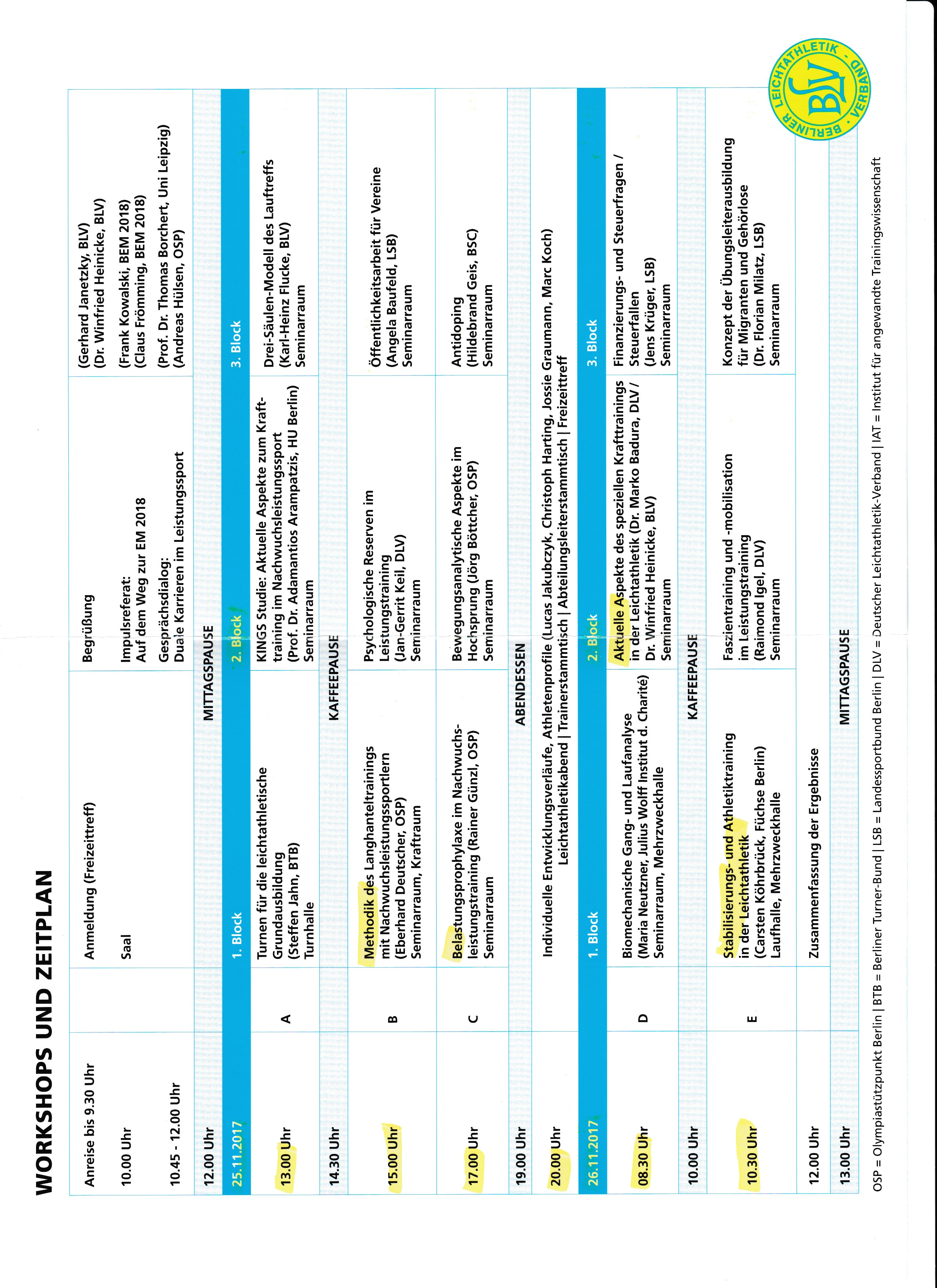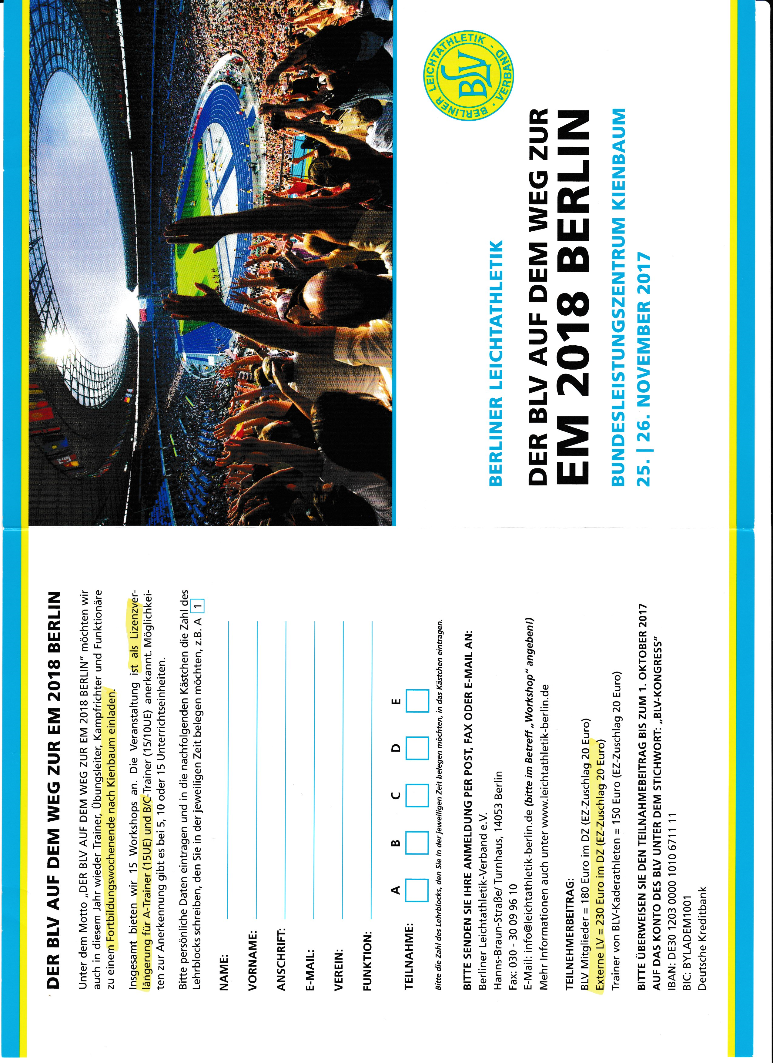 Der Berliner Leichtathletik-Verband bietet vom 25. - 26.11.2017 im Olympischen und Paralympischen Trainingszentrum in Kienbaum (ehem. BLZ Kienbaum) ein Weiterbildungswochenende für alle Trainer/innen, Übungsleiter, Kampfrichter und Funktionäre an. Unter dem Motto "Auf dem Weg zur EM nach Berlin 2018" können die insgesamt 15 Workshops zur Lizenzverlängerung für A-Trainer sowie B- und C-Trainer genutzt werden. Nähere Informationen finden Sie unter www.leichtathletik-berlin.de bzw. im mitgesandten Flyser (s. PDF).