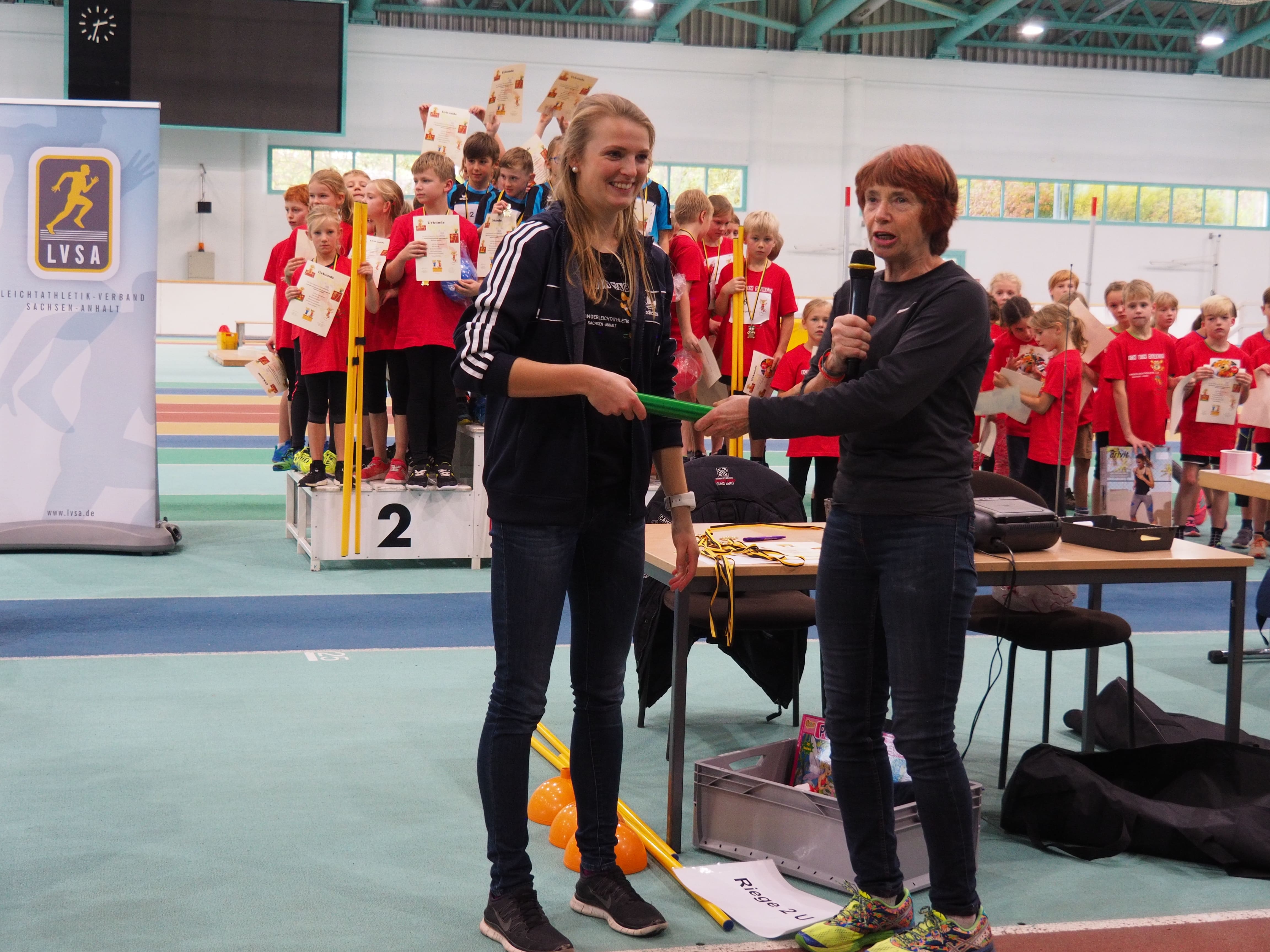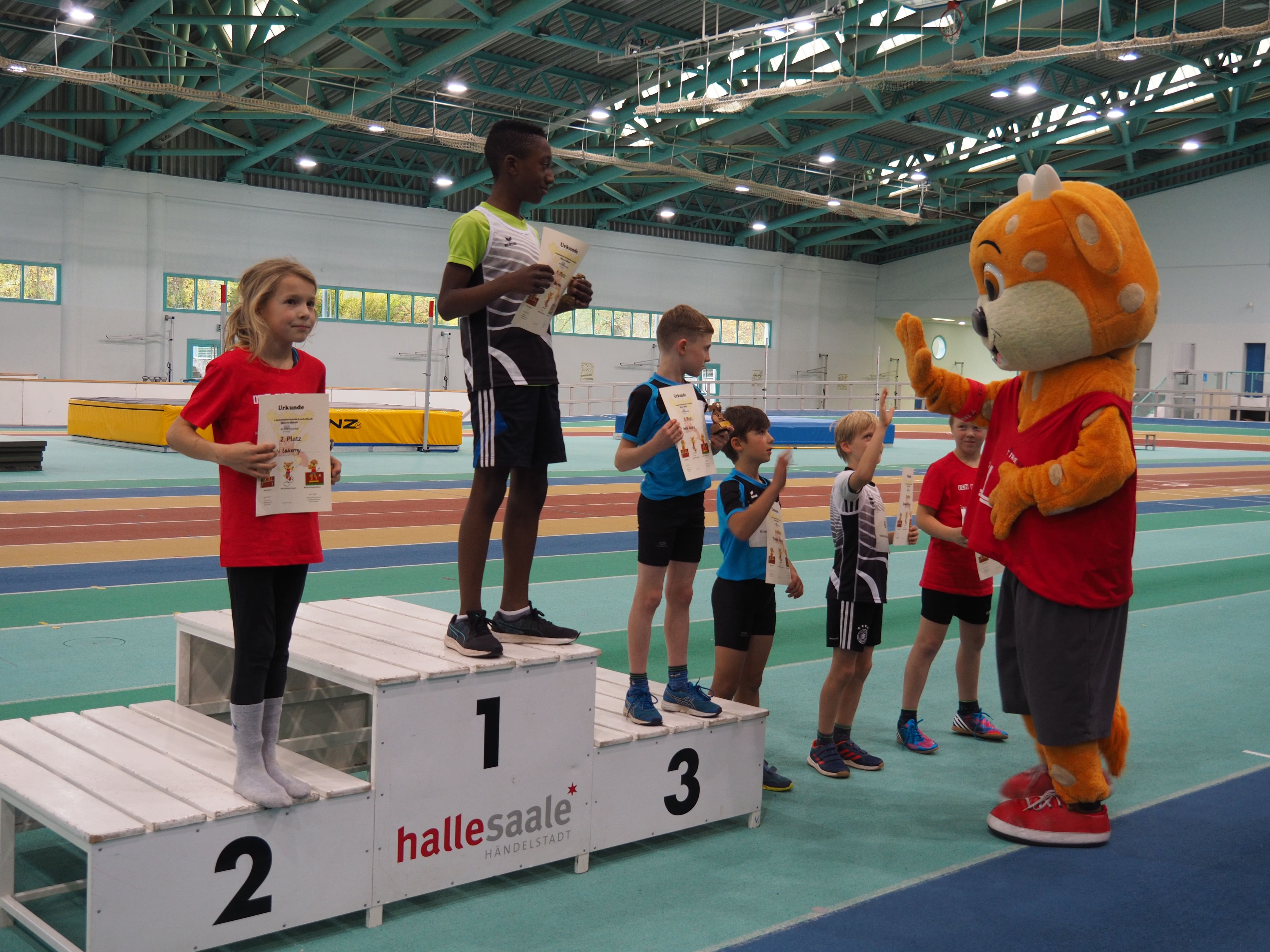 Am 10. November 2018 fand in der Brandbergehalle in Halle (Saale) das erste Kinderleichtathletikfinale der Altersklasse U10 (Mädchen und Jungen im Alter von 7 bis 9 Jahre) statt, an dem qualifizierte Teams aus ganz Sachsen-Anhalt teilnahmen. So traten 14 Teams im Dreikampf (40m-Sprint, Wechselspringen, Medizinballstoßen) und zusätzlich in der Hindernissprintstaffel und im spannungsgeladenen Teambiathlon gegeneinander an. Die Stimmung in der Halle glich der Atmosphäre bei der Europameisterschaft im Berliner Olympiastadion. Alle Kinder wurden von ihren Teammitgliedern und Trainern angefeuert und zu Spitzenleistungen motiviert. Zusätzlich sorgte das DLV-Maskottchen JuLe für Stimmung zwischen den Wettbewerben, indem es selbst die eine oder andere Disziplin ausprobierte und sich Tipps von den jungen Athleten und Athletinnen holte. Bei der Frage nach dem Highlight der Veranstaltung riefen alle Kinder ganz laut: BIATHLON. Die abschließende Staffelform legte nach Beendigung aller anderen Wettbewerbe und Bekanntgabe des Zwischenstandes die Platzierungen fest und wies daher den größten Aufforderungscharakter auf. Die Teams pushten sich gegenseitig zu Höchstleistungen, wobei es niemanden in der Halle mehr auf den Stühlen hielt. Am Ende stand das Ergebnis fest: Sieger des 1. Landesfinales ist das Team des SV Graf Zeppelin Abtsdorf. Auf Rang 2 platzierte sich „die grüne Flut“ (SV Halle), dicht gefolgt vom Team des PSV Bernburg. Zusätzlich erfolgte eine Einzelmehrkampfwertung des Dreikampfes, wobei Viktor Agbo-Anih (SG Buna Halle) und Romy Seehausen (Lok Aschersleben) als Sieger hervorgingen. Bei der Siegerehrung wurden die Teams von einem Ehrengast - der Deutschen Jugendmeisterin und EM-Finalistin - Sina Prüfer überrascht. Sie beglückwünschte alle Teams und überreichte Medaillen und Pokale an die Besten. Alle Kinder erhielten eine Teilnehmerurkunde und ein T-Shirt als Andenken an das Landesfinale. Die ersten drei Teams erhielten Medaillen und Sachpreise (Materialien und Sportgeräte), um sich im Training fleißig auf das 2. Landesfinale am 09.11.2019 vorzubereiten. Bereits jetzt folgte viel positive Resonanz, die Organisation und Durchführung wurde gelobt, alle Kinder hatten großen Spaß und möchten im nächsten Jahr wieder um den Titel kämpfen.