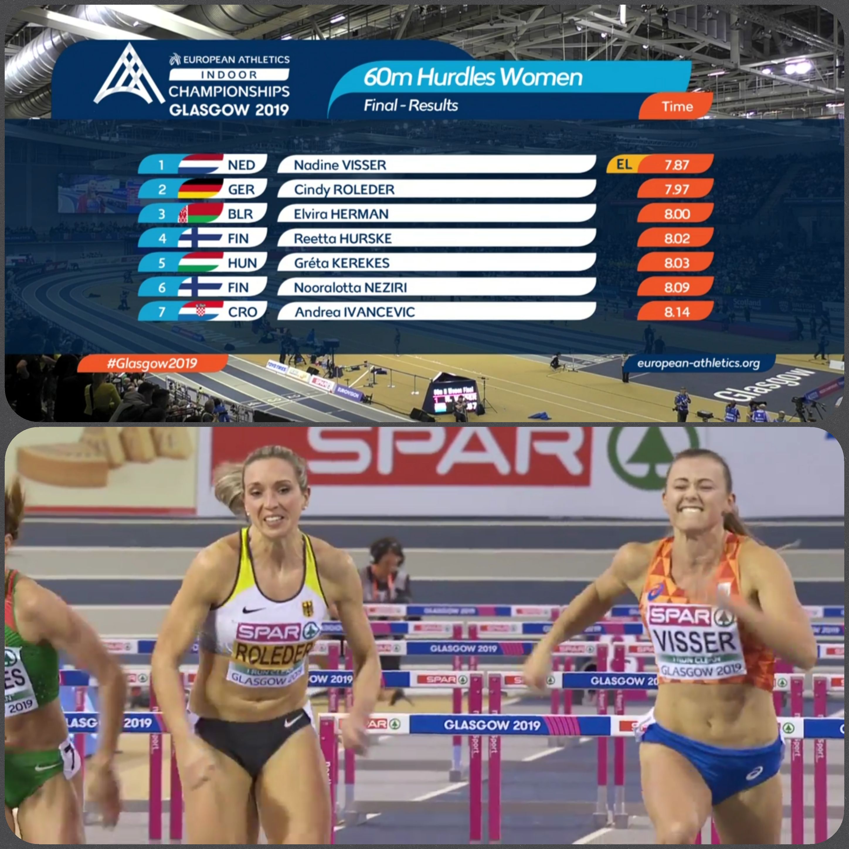 Titelverteidigerin Cindy Roleder (SV Halle) hat am Sonntagabend die Silbermedaille über 60 m Hürden im Finale der 35. Hallen-Europameisterschaften in Glasgow gewonnen. Die 29-jährige Hürdensprinterin startete verhalten, fand jedoch immer besser in ihren Rhythmus. Lediglich die Holländerin Nadine Visser enteilte ihr in 7,87 s. Roleder sprintete 7,97 s (s. Foto).