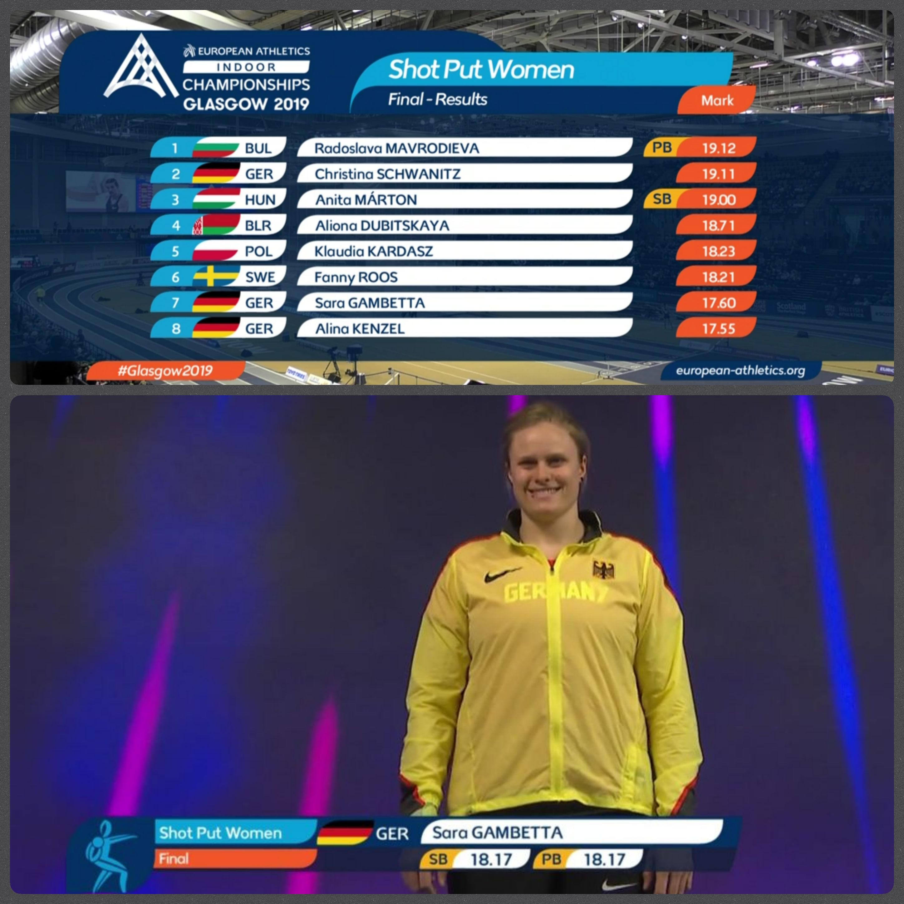 Sara Gambetta (SV Halle) belegte im Kugelstoßen der Frauen mit 17,60 m Rang 7 (s. Foto). Im Vorkampf stellte sie, wie bereits zu den Deutschen Hallenmeisterschaften, eine neue persönliche Hallenbestmarke mit 18,17 m auf. Christina Schwanitz (LV 90 Erzgebirge) wurde mit 19,11 m Vizeeuropameisterin. Ein Zentimeter fehlte ihr an der ersehnten Goldmedaille.