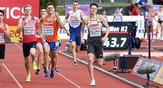 „Seine Position in der europäischen Bestenliste (Platz 26) hätte nicht unbedingt erwarten lassen, dass Maximilian Sluka (Hallesche Leichtathletik-Freunde; s. Foto Iris Hensel) im 1.500 Meter-Finale um die Medaillen fighten kann. Aber der U20-WM-Teilnehmer hatte sich einiges vorgenommen. Auf der ersten Runde hielt er sich aus dem vorderen Gerangel raus und wartete den richtigen Moment ab, um sich weiter nach vorne zu schieben. Auf der letzten Runde attackierte der 19-Jährige in einem insgesamt langsamen Rennen eine Position in den Medaillenrängen. Erst auf der Zielgeraden musste er sich im Endspurt um die Podestplätze knapp geschlagen geben. In 03:56,54 min wurde er Vierter" (www.leichtathletik.de).